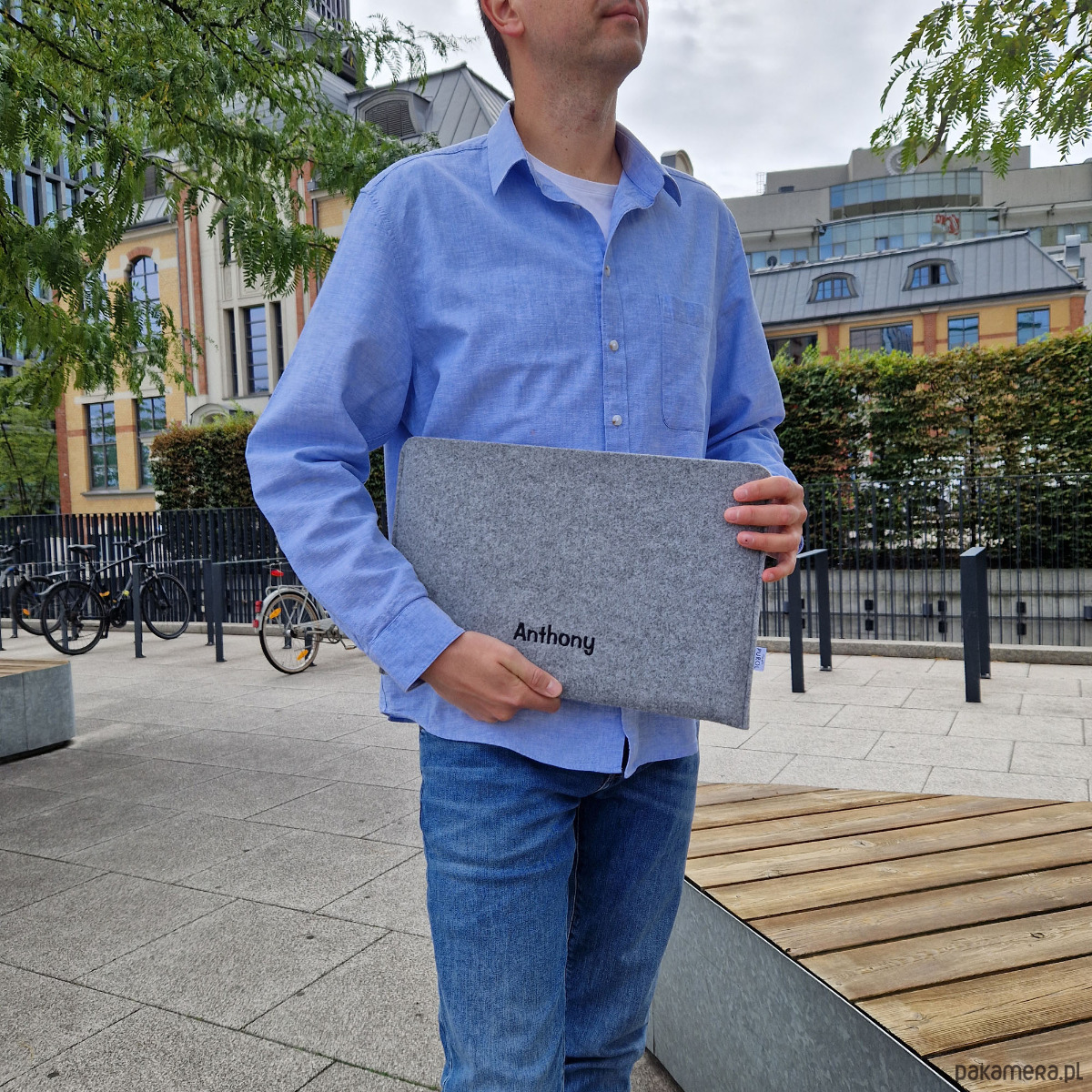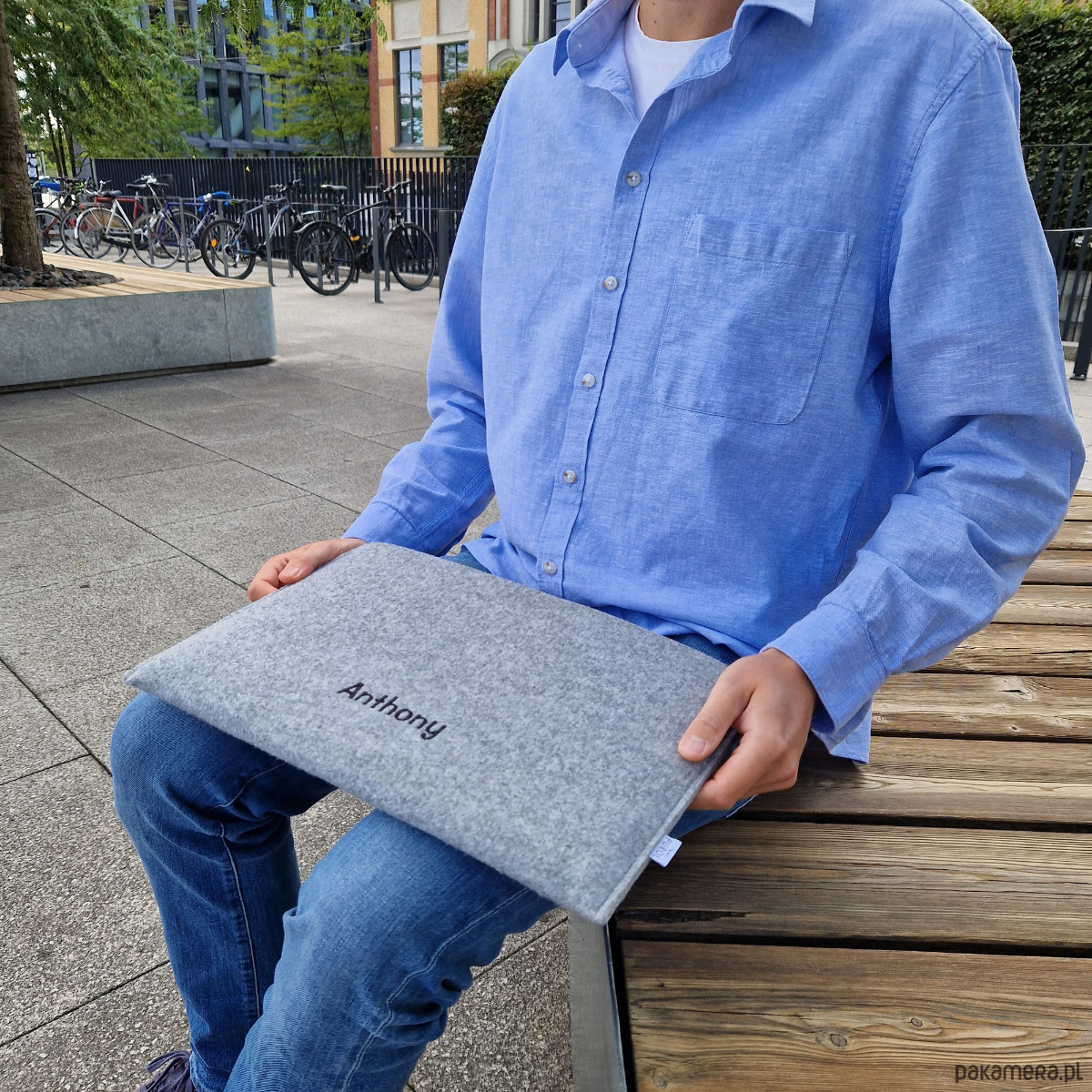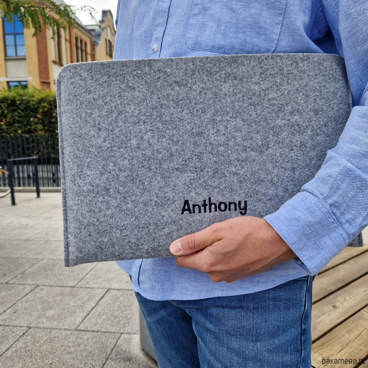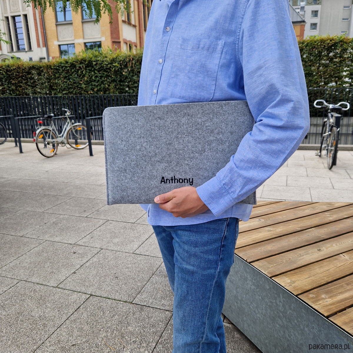 Uszyty na wymiar filcowy pokrowiec na laptopa z wyhaftowanym imieniem. Ręcznie wykonane etui - wersja pozioma.