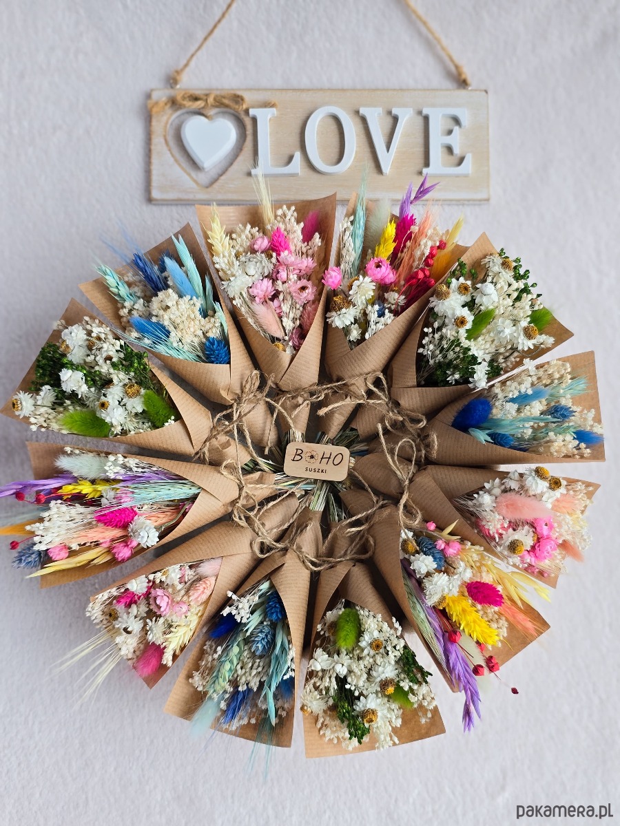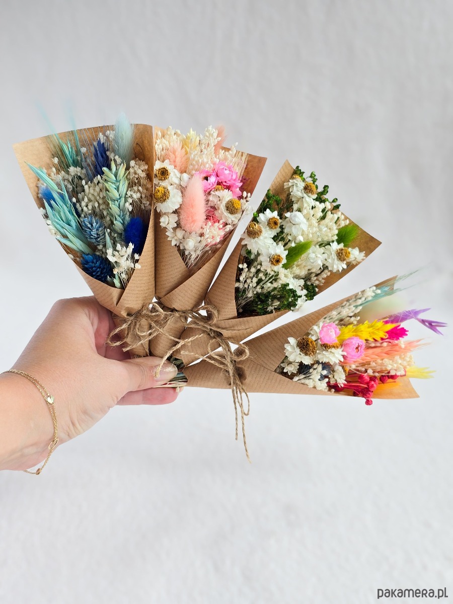 Każdy bukiet wykonywany jest ręcznie z naturalnych suszonych kwiatów, dlatego każdy jest nieco inny - niepowtarzalny i wyjątkowy.