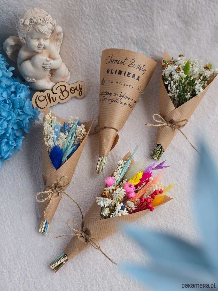 Małe bukieciki wykonane ręcznie z suszonych kwiatów. Każdy owinięty w papier z personalizowanym nadrukiem z imieniem dziecka, datą oraz tekstem "Dziękujemy, że byliście z nami w tym wyjątkowym dniu" - tworzą wyjątkowe podziękowania ślubne w stylu rustykalnym i boho.