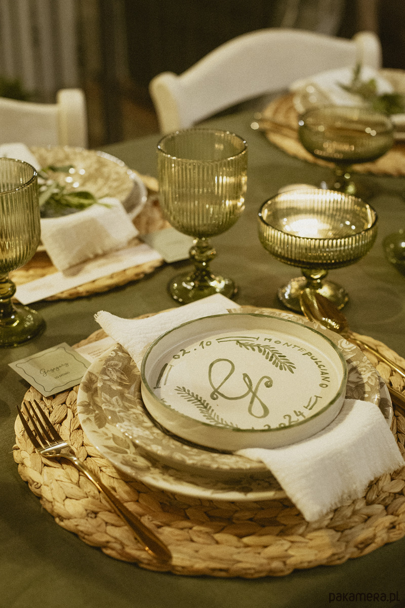 Na talerzach znajdą się wasze inicjały, data oraz miejsce ślubu, a także dekoracyjne ornamenty.
