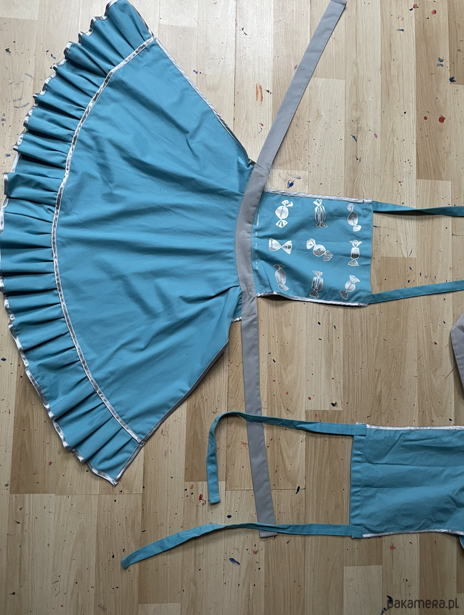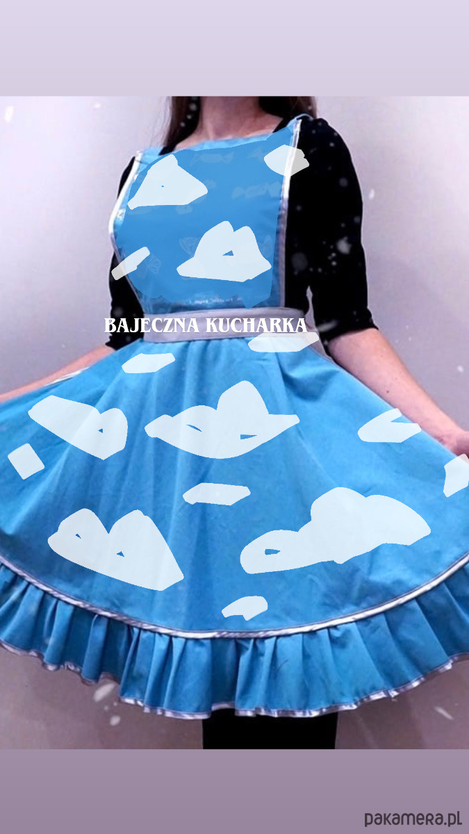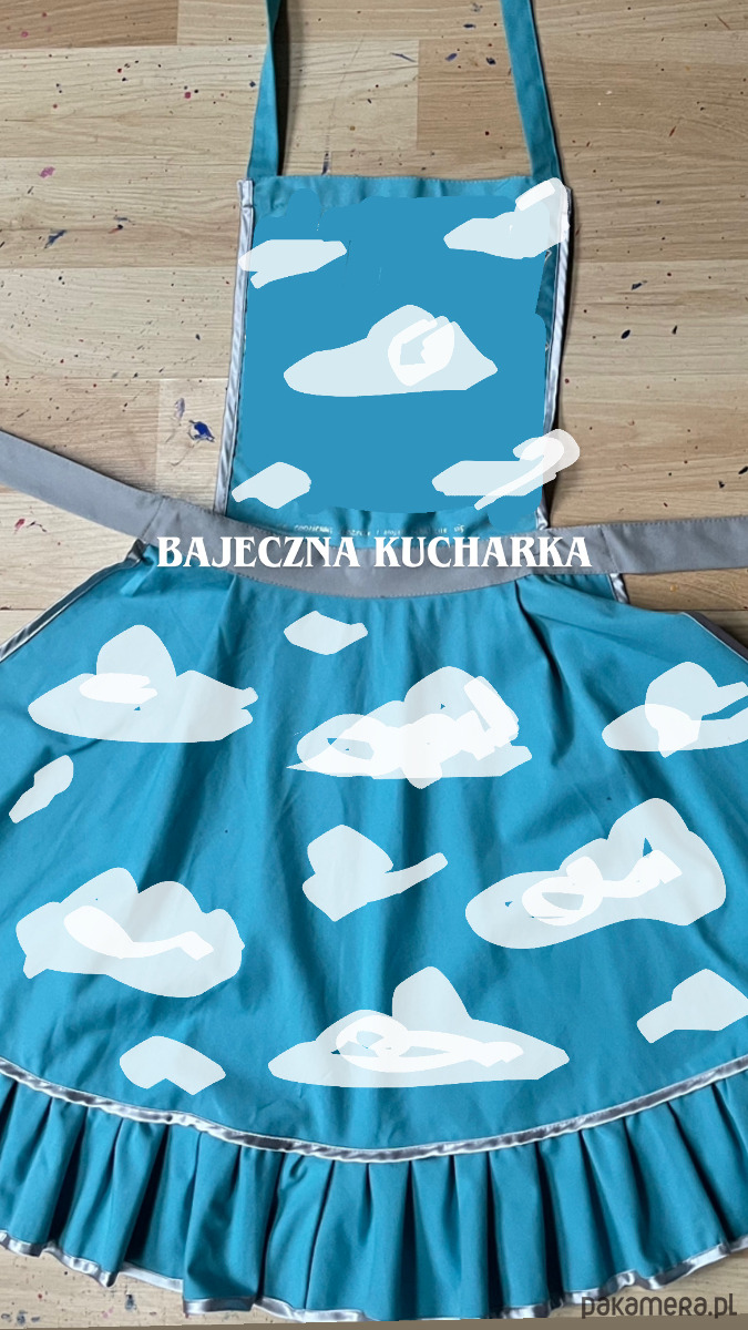 Personalizowany niebieski fartuszek z malowanymi ręcznie białymi chmurkami nawiązującymi do stroju Zofii z serialu 1670, karczek odwrócony cukierkami do wewnątrz, w talii napis „bajeczna kucharka”.