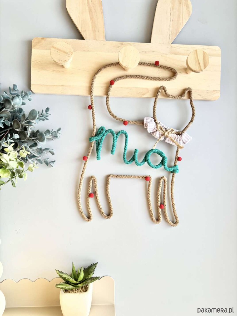 Urocza dekoracja w kształcie kotka z imieniem dziecka , wykonana ręcznie ze sznurka bawełnianego oplatającego solidny drut, który nadaje formę i trwałość. Całość zdobi delikatny kołnierzyk z bawełnianej tkaniny, dodający projektowi wyjątkowego charakteru i przytulności.