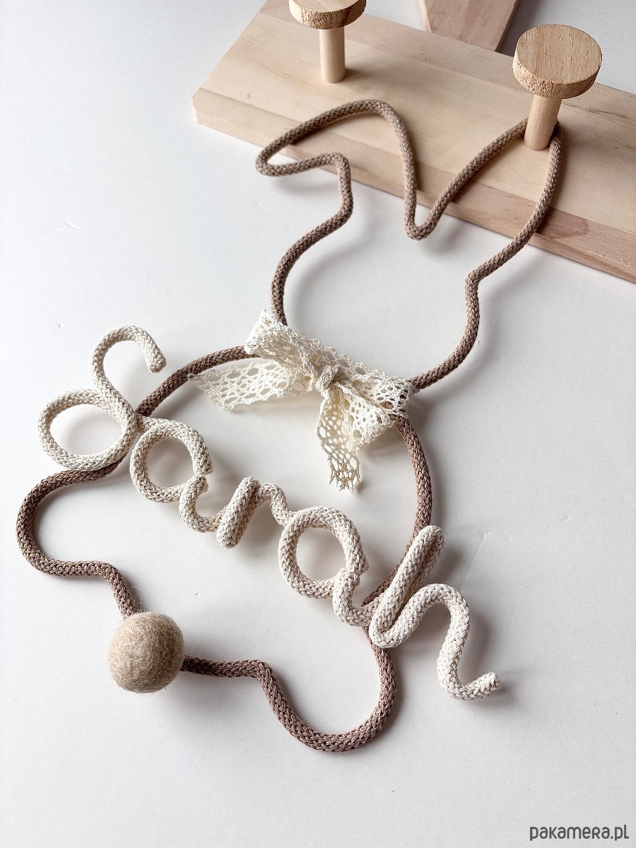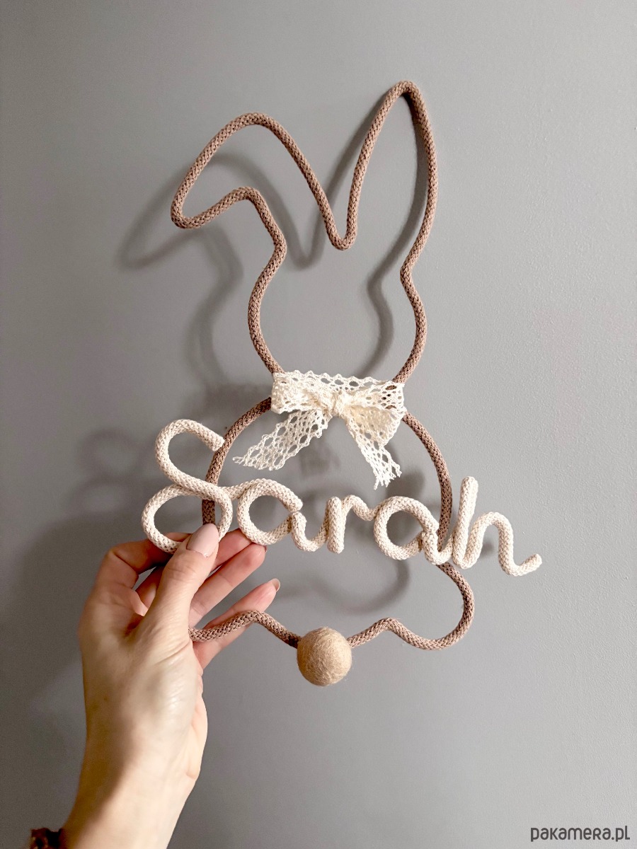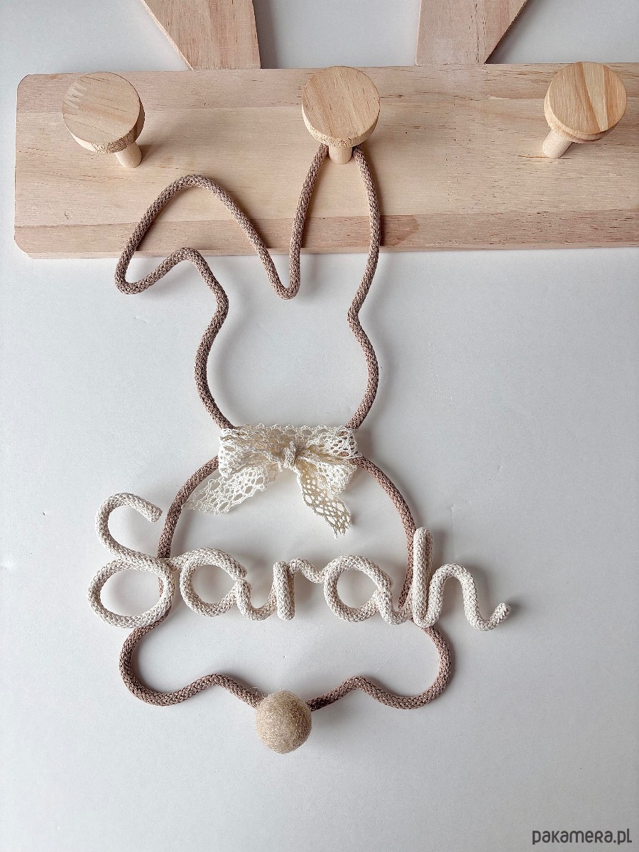 Uroczy, ręcznie wykonany króliczek z delikatną koronkową kokardą to piękna i ponadczasowa dekoracja do pokoju niemowlaka lub dziecka. Personalizacja imieniem sprawia, że ozdoba staje się wyjątkową pamiątką oraz oryginalnym prezentem na narodziny dziecka lub baby shower.