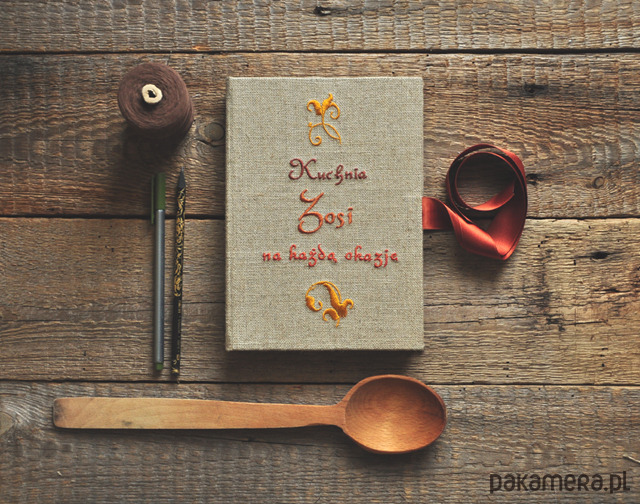 Okładka z wyhaftowanym napisem - możliwość wyhaftowania dowolnej treści w dowolnych kolorach, np. "ciasta Ani", "Książka kucharska Tosi" itd... (po zakupie proszę o info poprzez kontakt).
