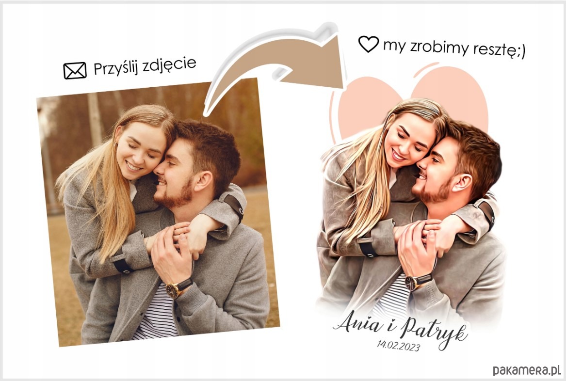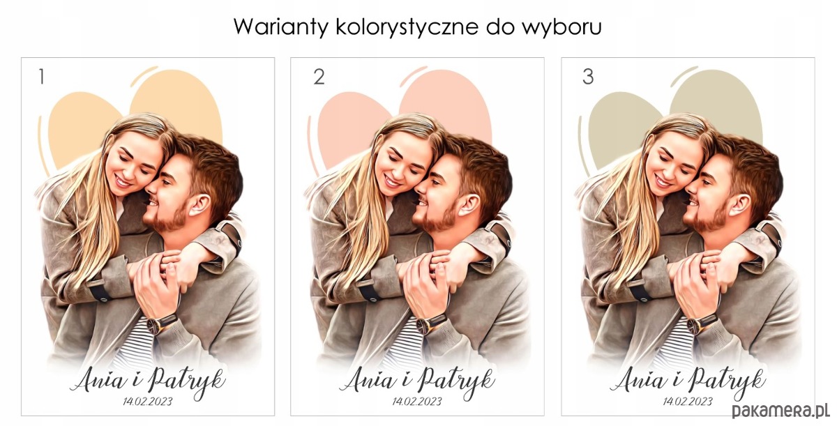 - Prześlij zdjęcie na nasz adres mailowy (Jeżeli masz wątpliwości, które zdjęcie najlepiej nadaje się na portret, prześlij do nas 2-3 propozycje, wybierzemy to które nadaje się najlepiej) Wyślij również imiona oraz napisz który wariant kolorystyczny Cię interesuje.