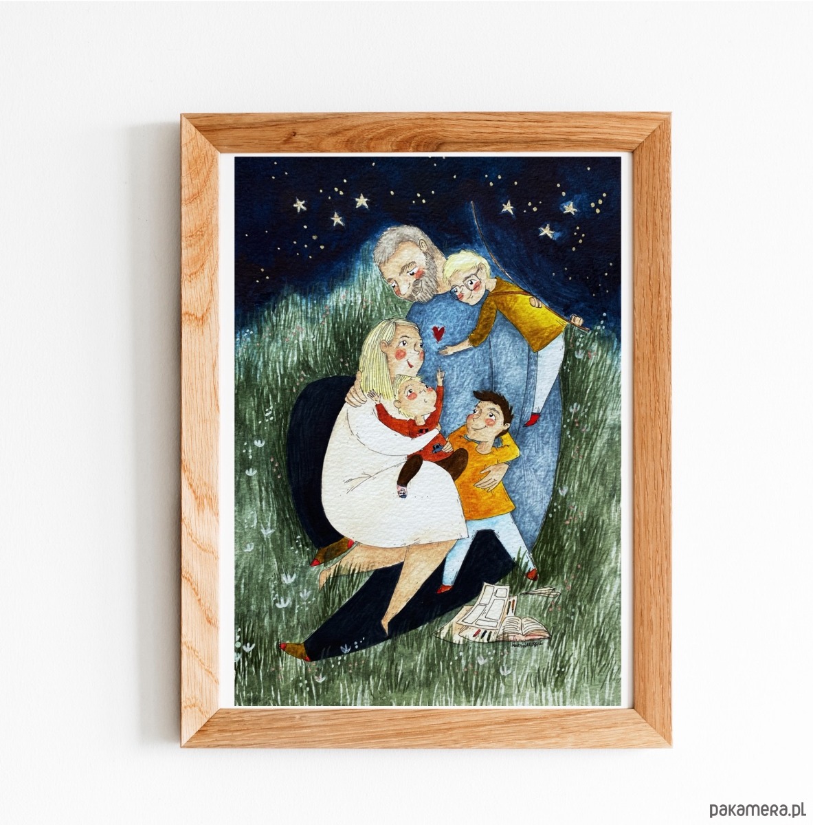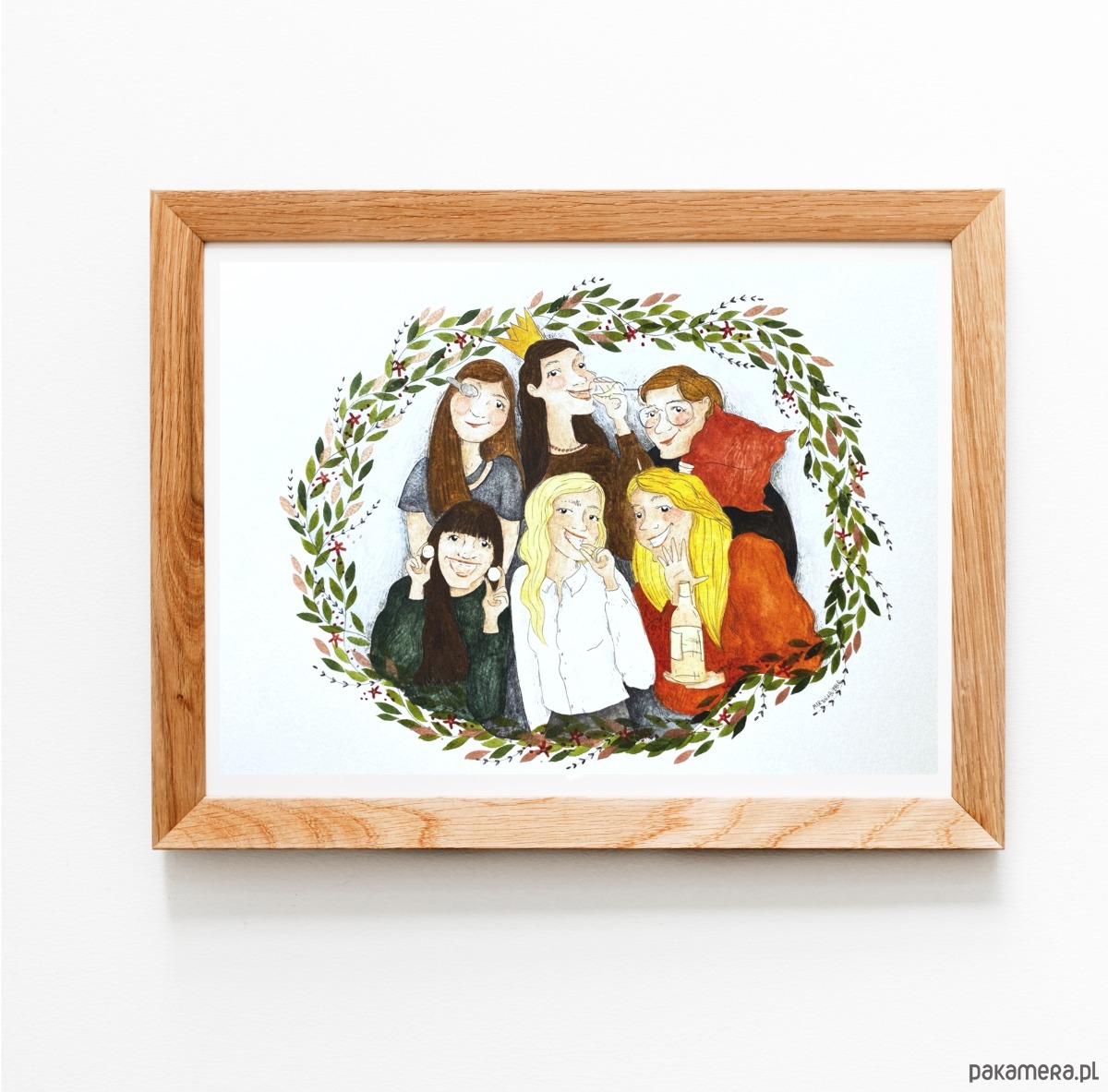 Portret personalizowany rodzinny to ręcznie malowany bajkowy portret dużej rodziny i przyjaciół - na takich portretach malowałam nawet 20 osób!