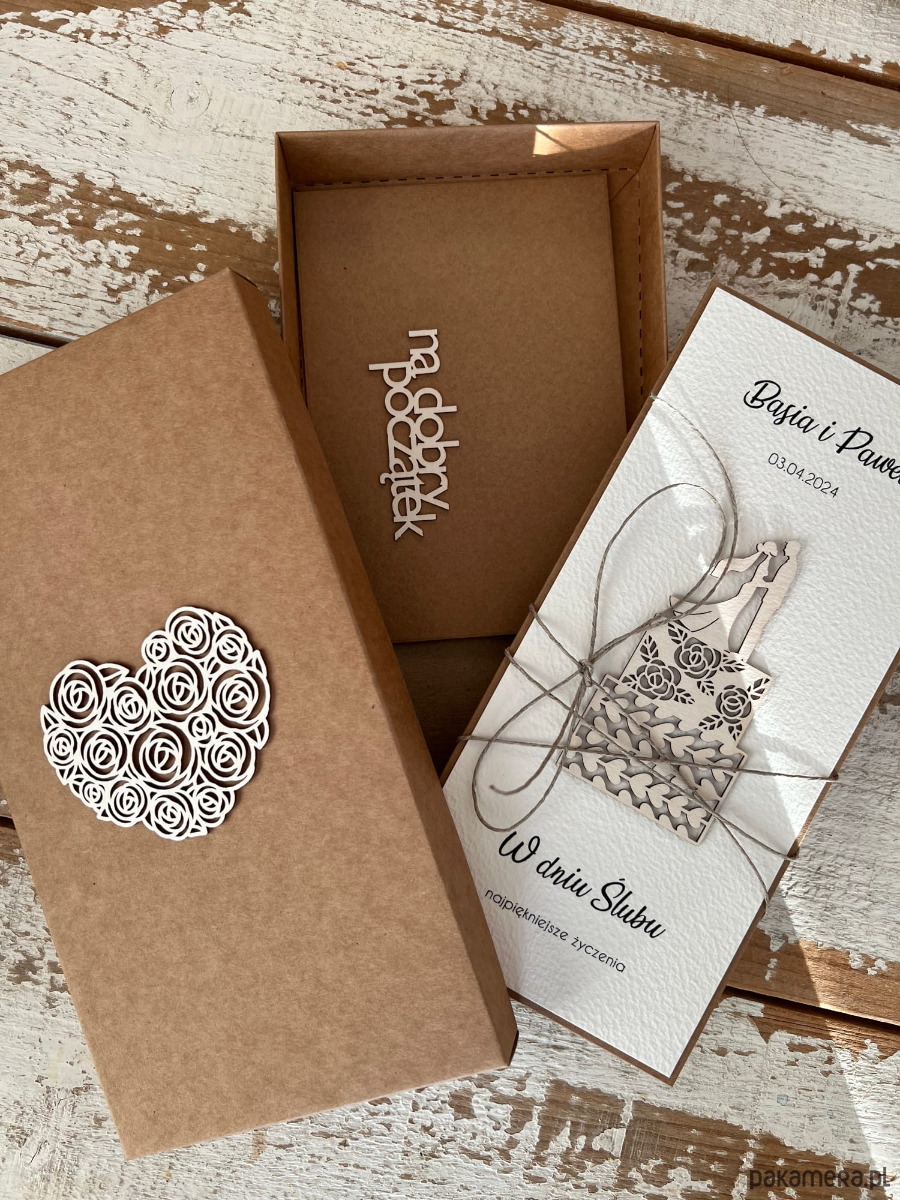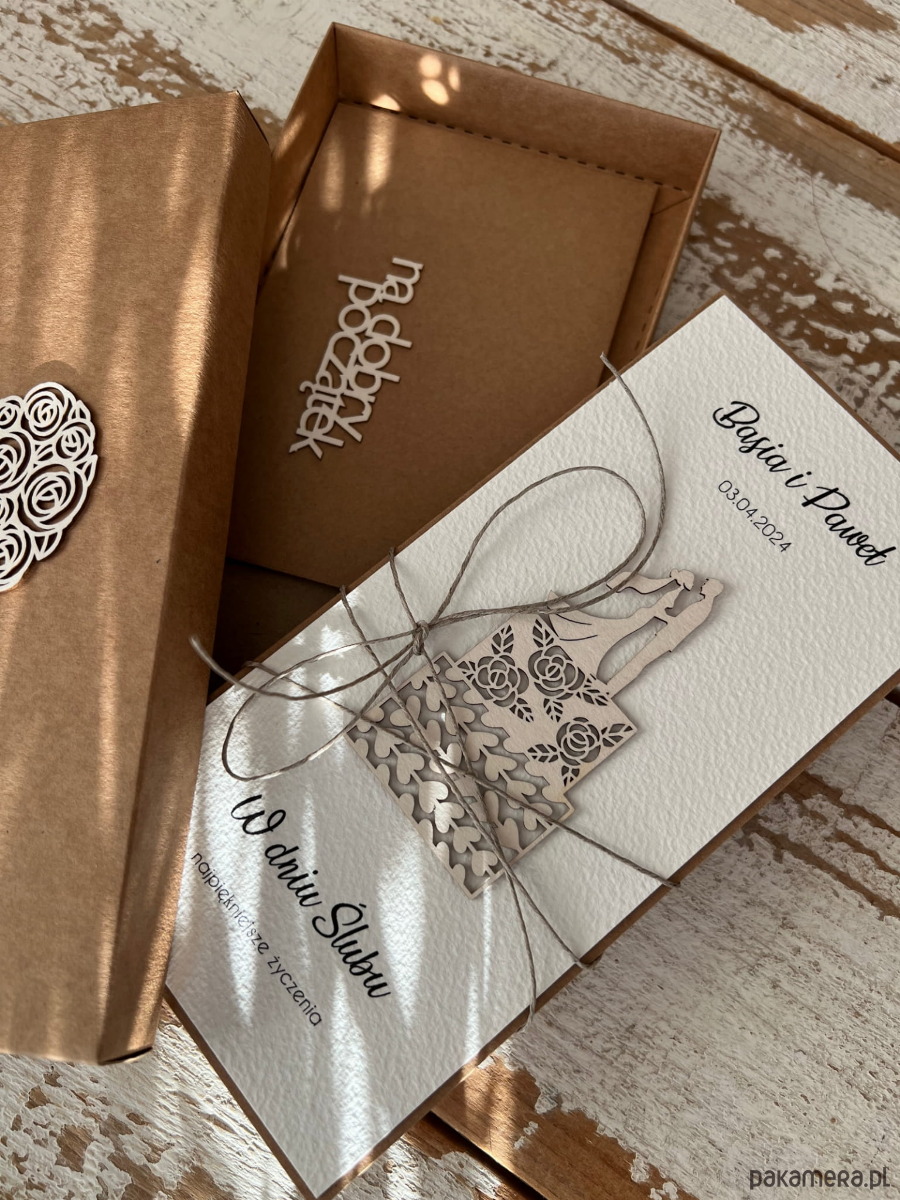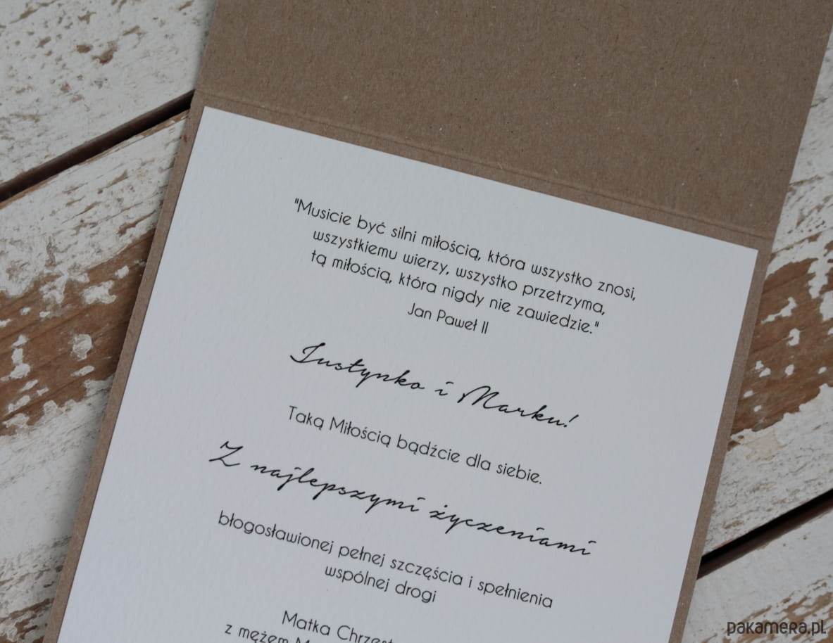 Wymiary: kartka DL otwierana na lewo, przewiązana lnianym sznureczkiem w zestawie z brązowym pudełkiem oraz kopertą na pieniądze - w jęz. polskim lub angielskim - wymiary 10x14,5 cm.