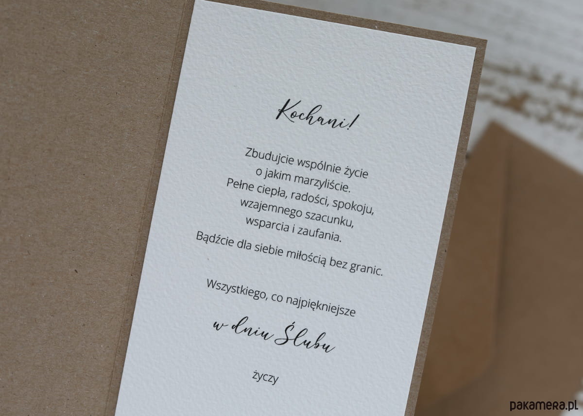 Personalizowana kartka ślubna, na ślub wykonana jest na bazie papieru kraftowego z użyciem starannie wyselekcjonowanego papieru bawełnianego w kolorze śmietanki z nadrukiem oraz tekturkową ozdobą. Kartka przewiązana jest lnianym sznureczkiem.