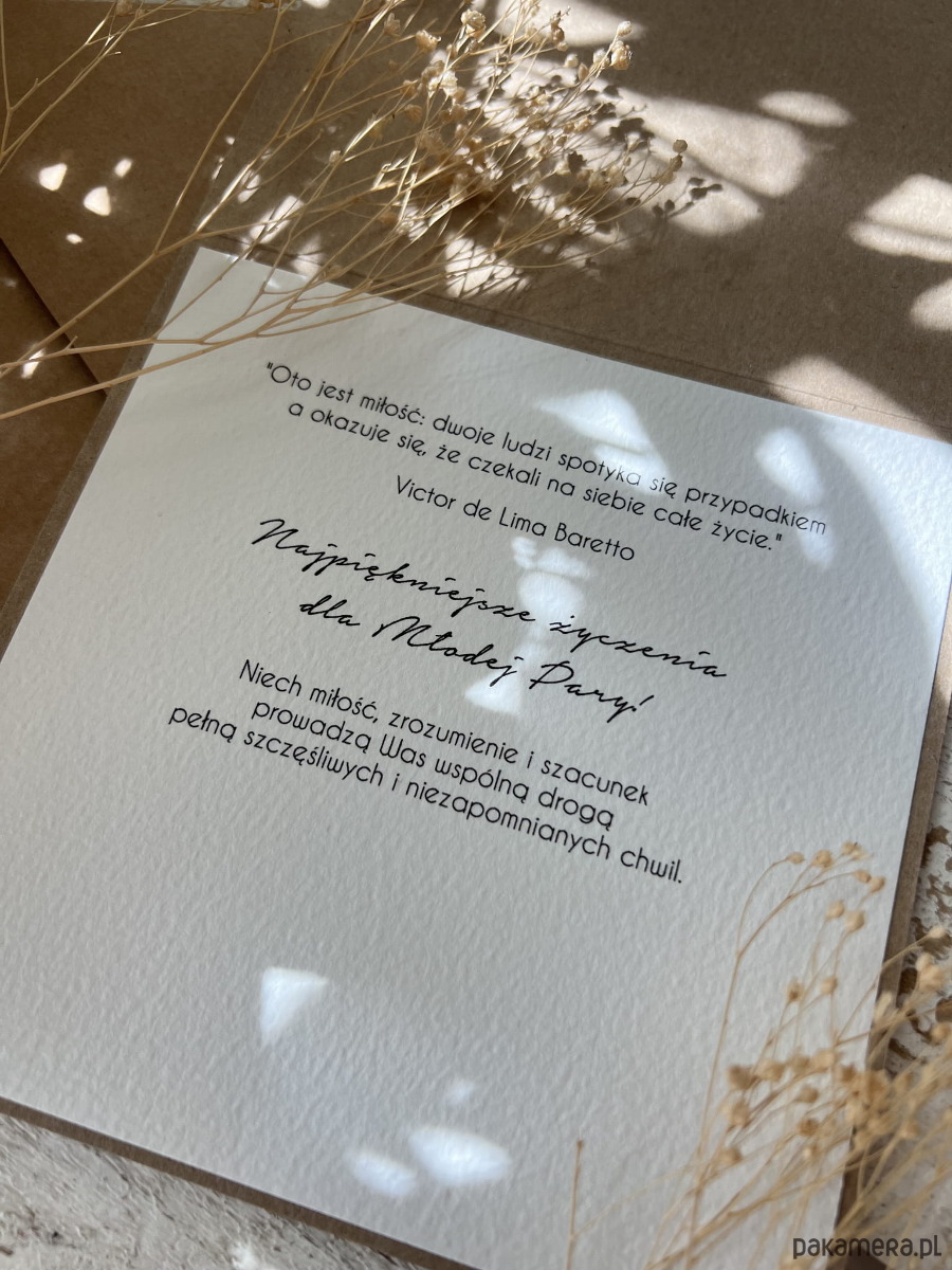 Personalizowana kartka ślubna, na ślub wykonana jest na bazie papieru kraftowego z użyciem starannie wyselekcjonowanego papieru bawełnianego w kolorze śmietanki z nadrukiem oraz tekturkową ozdobą. Kartka przewiązana jest lnianym sznureczkiem.