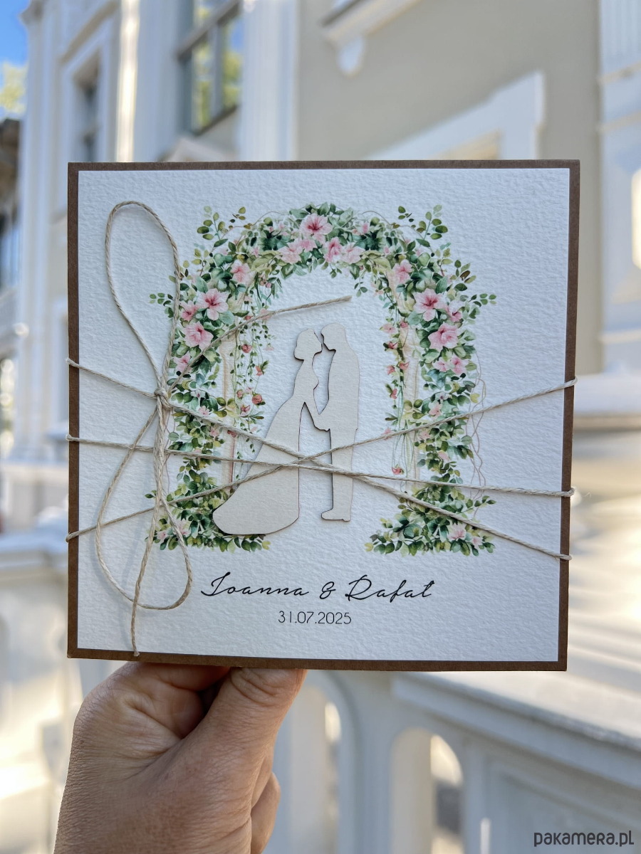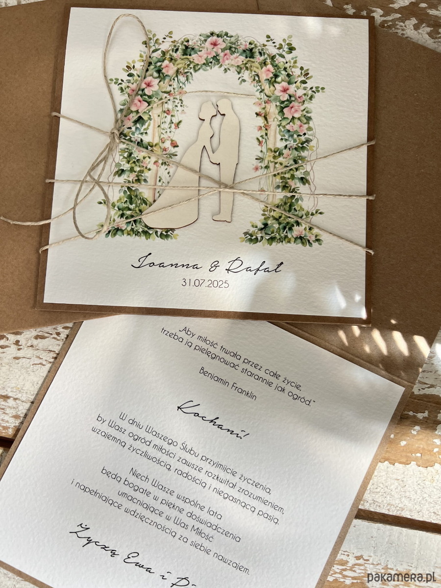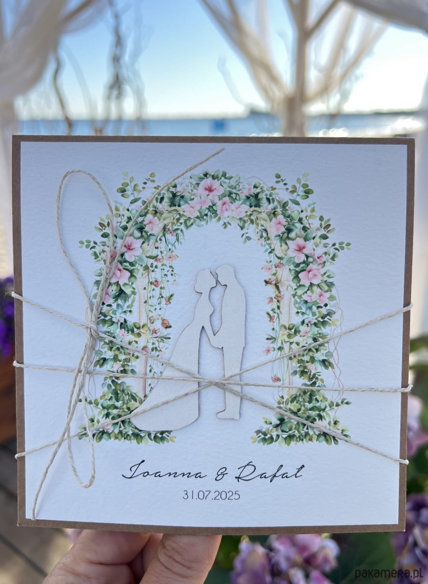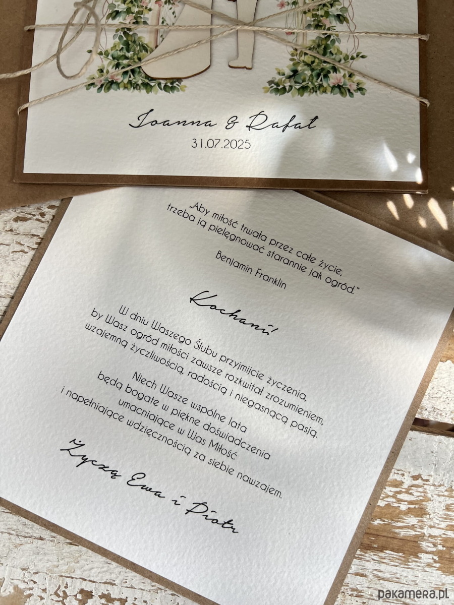 Personalizowana kartka ślubna, na ślub wykonana jest na bazie papieru kraftowego z użyciem starannie wyselekcjonowanego papieru bawełnianego w kolorze śmietanki z nadrukiem oraz tekturkową ozdobą. Kartka przewiązana jest lnianym sznureczkiem.