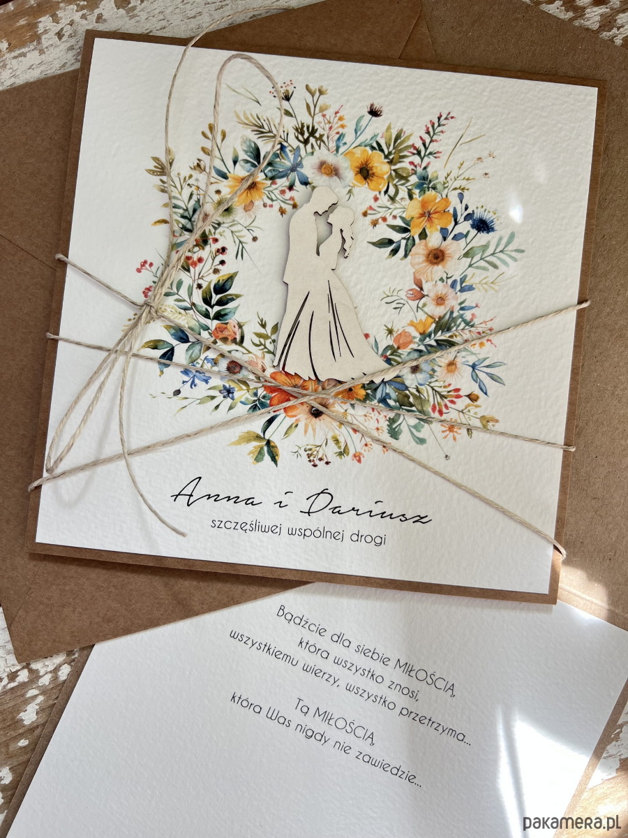 Personalizowana kartka ślubna, na ślub wykonana jest na bazie papieru kraftowego z użyciem starannie wyselekcjonowanego papieru bawełnianego w kolorze śmietanki z nadrukiem oraz tekturkową ozdobą. Kartka przewiązana jest lnianym sznureczkiem.
