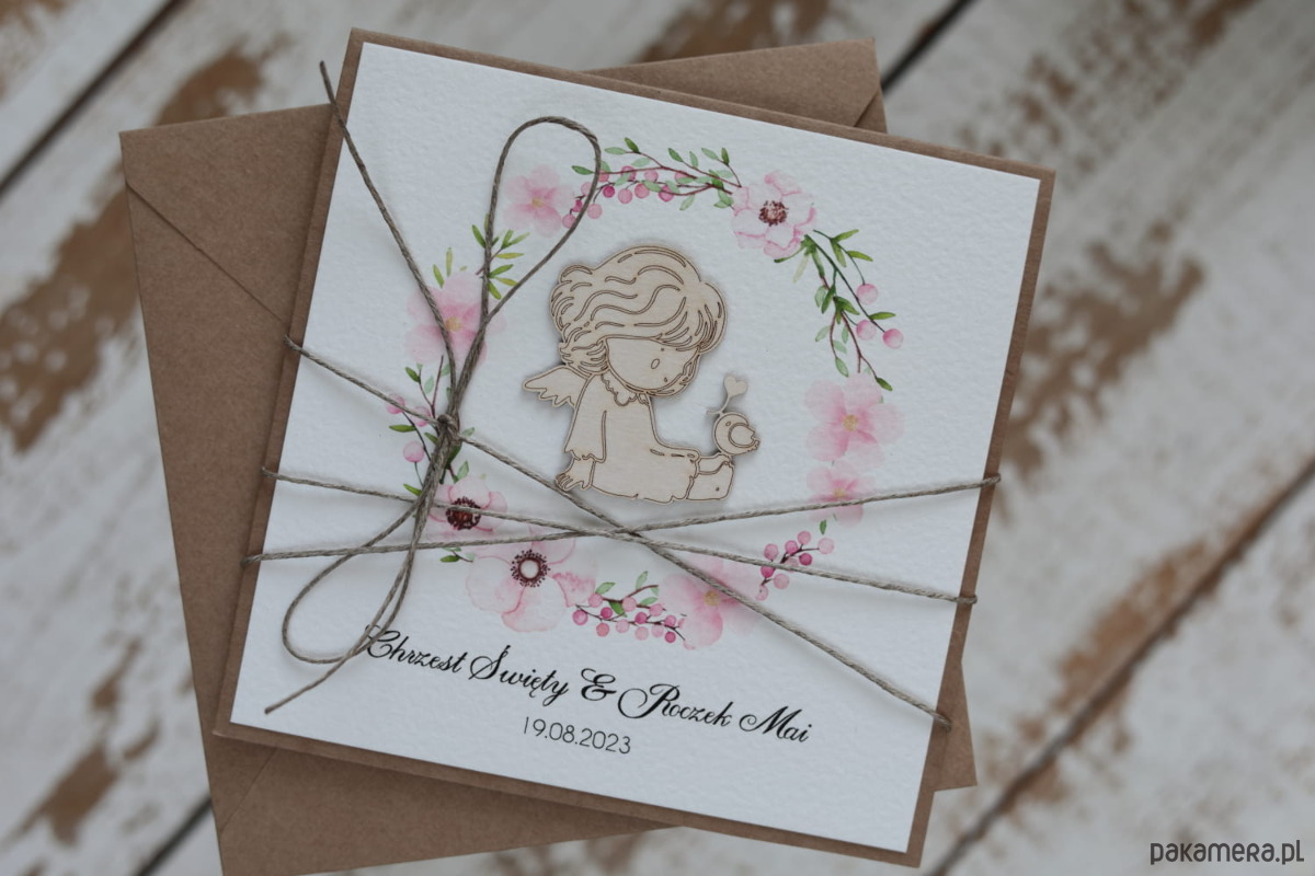 Kartka wykonana jest z najwyższej jakości starannie dobranych materiałów i dodatków w tym papieru kraftowego, ekologicznego papieru bawełnianego - 100% bawełny. w odcieniu śmietanki, tekturkowej ozdoby. Personalizowana na przodzie w postaci imienia, daty chrztu, życzeń.