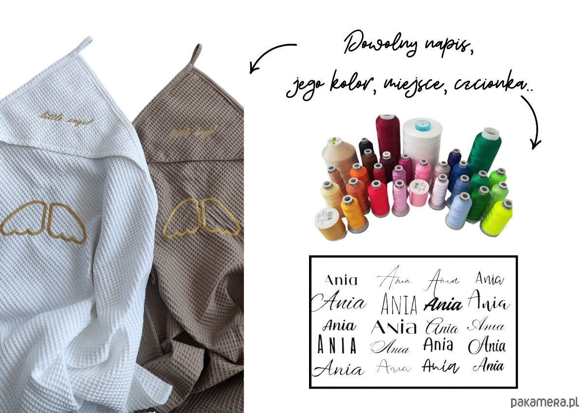 W uwagach do zamówienia prosimy o podanie napisu jaki mamy umieścić na ręczniku oraz w jakim ma być mniej więcej kolorze (np zielony, brązowy) . W odpowiedzi prześlemy jakie są odcienie wafla w tym kolorze (jeśli nie mamy interesującego koloru na miejscu to go zamówimy) oraz prześlemy napis w różnych czcionkach do wyboru. Uzgodnimy również kolor napisu.