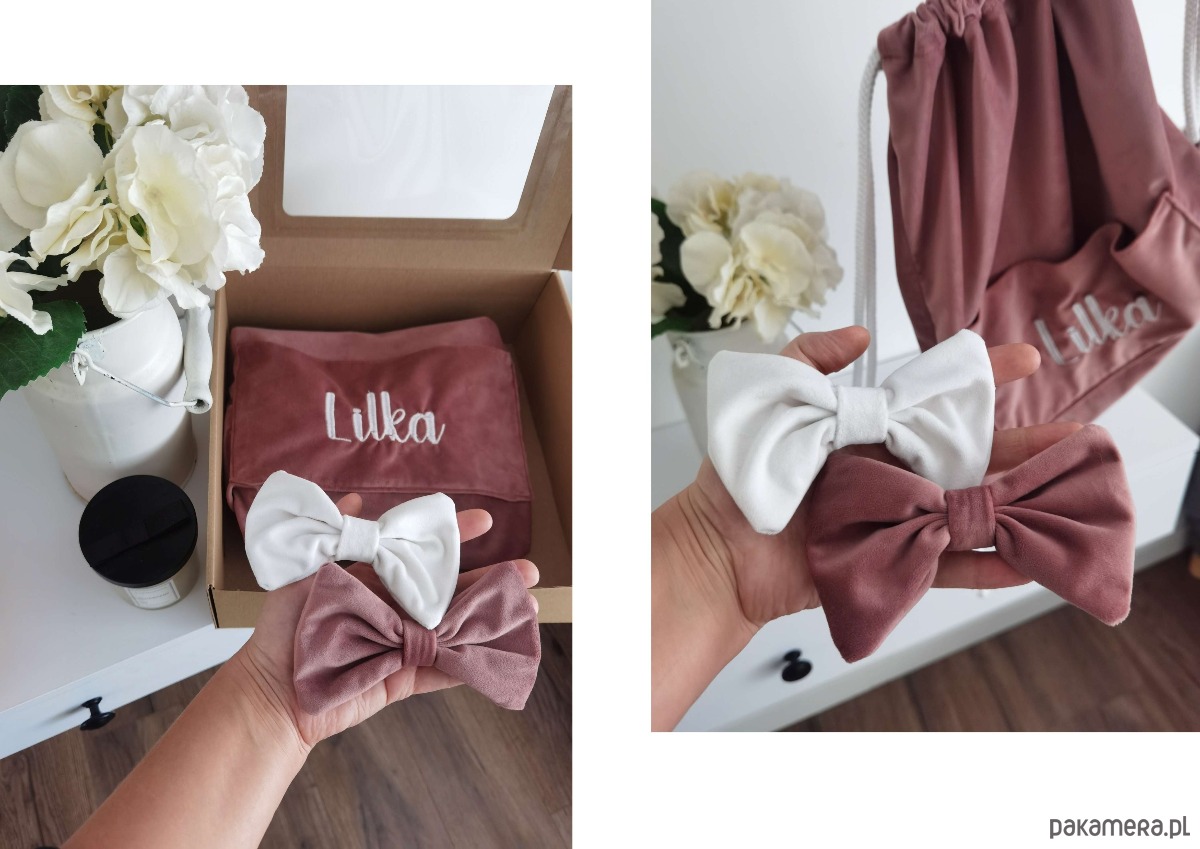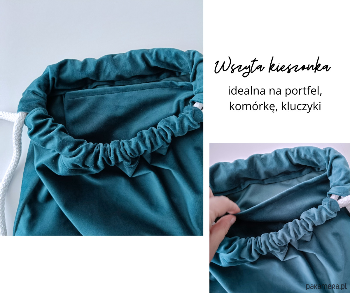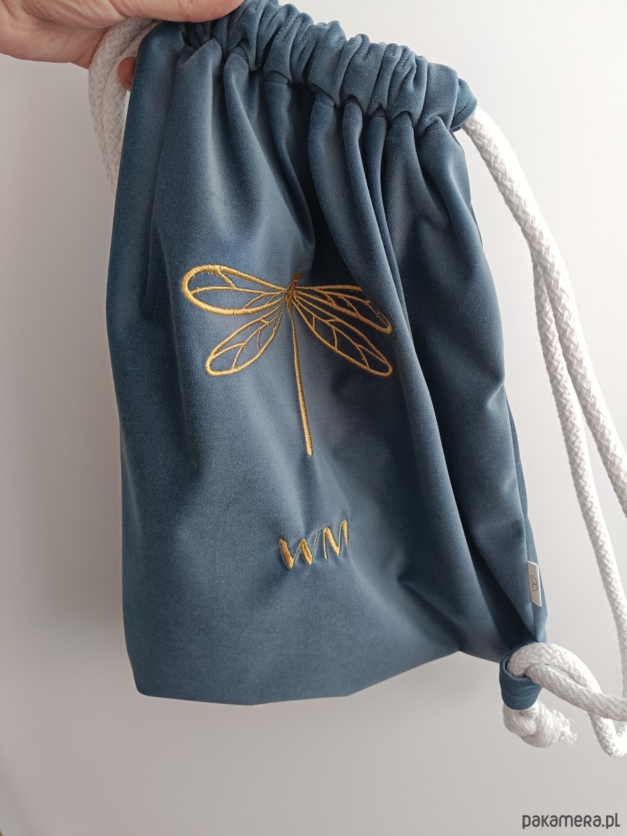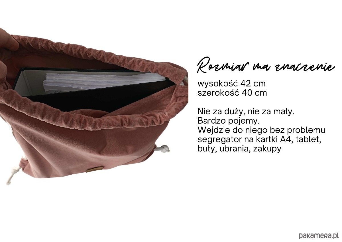 Gadżet dla każdego:) Dla najmłodszych jako plecak do żłobka, przedszkola na ubranka, zabawki, brudy, dla uczniów jako worek na wf i dla dorosłych jak podręczna torebka, plecak na rower, na basen, zakupy. Wykonany z grubej, przyjemnej w dotyku i łatwej w utrzymaniu czystości tkaniny - velvetu. Różne kolory do wyboru. Na plecaku haftujemy dowolny krótki napis, obrazek, imię. Plecak może mieć kieszonkę, uszy króliczka, misia, może być też gładki, z falbanką, z samym napisem. Jest pojemny , jego rozmiar to 40x42 cm. Wejdą do niego i buty i ubranka, zeszyty A4, drobne zakupy. Jeżeli zależy Państwu na innym rozmiarze - możemy nim minimalnie manewrować.
