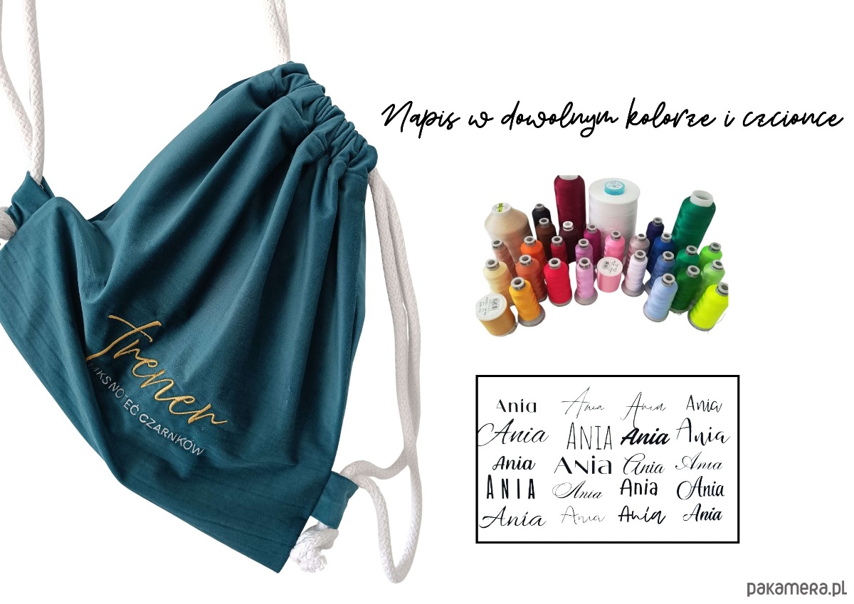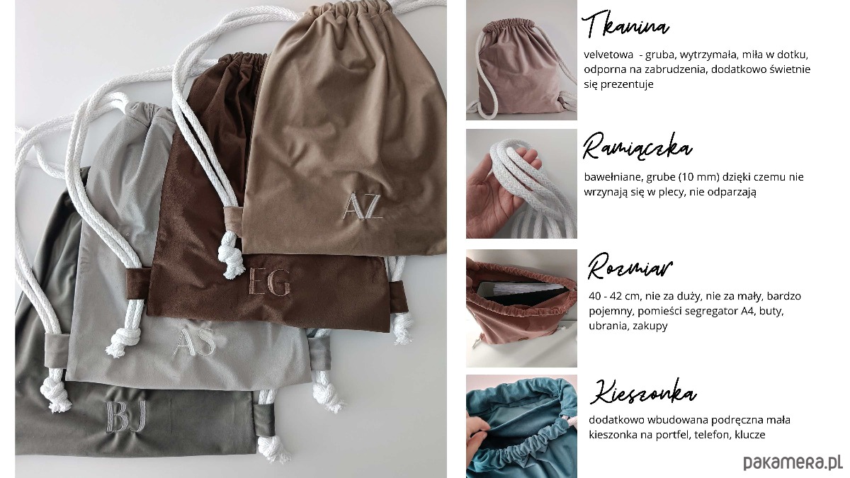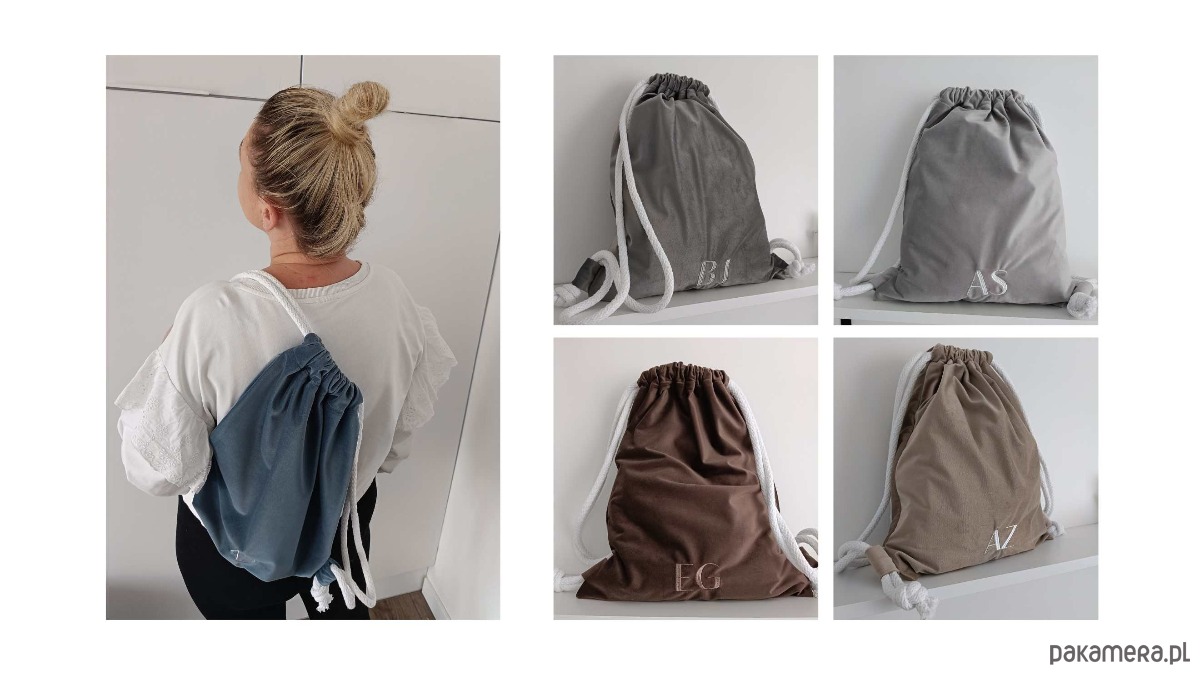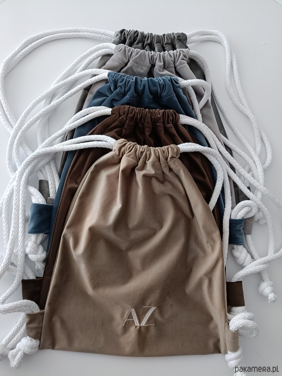 Gadżet dla każdego:) Dla najmłodszych jako plecak do żłobka, przedszkola na ubranka, zabawki, brudy, dla uczniów jako worek na wf i dla dorosłych jak podręczna torebka, plecak na rower, na basen, zakupy. Wykonany z grubej, przyjemnej w dotyku i łatwej w utrzymaniu czystości tkaniny - velvetu. Różne kolory do wyboru. Na plecaku haftujemy dowolny krótki napis, obrazek, imię. Plecak może mieć kieszonkę, uszy króliczka, misia, może być też gładki, z falbanką, z samym napisem. Jest pojemny , jego rozmiar to 40x42 cm. Wejdą do niego i buty i ubranka, zeszyty A4, drobne zakupy. Jeżeli zależy Państwu na innym rozmiarze - możemy nim minimalnie manewrować.