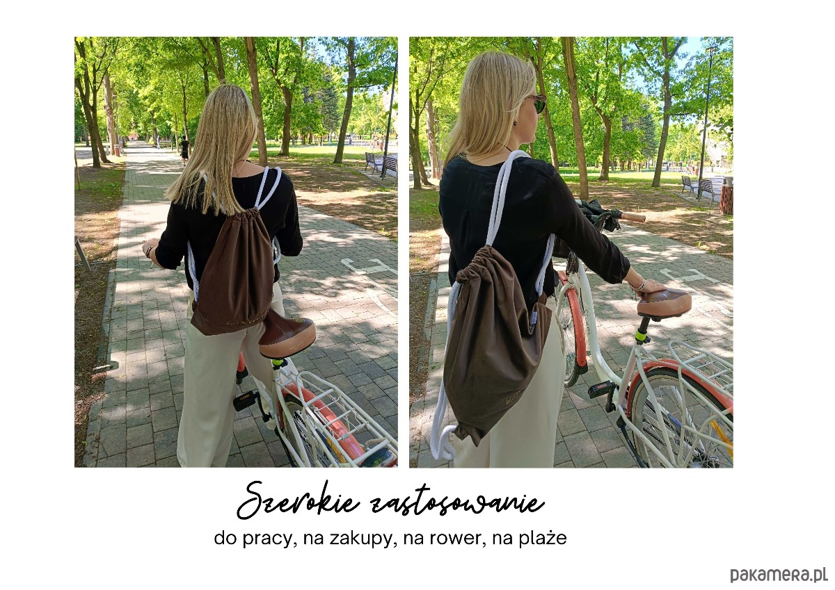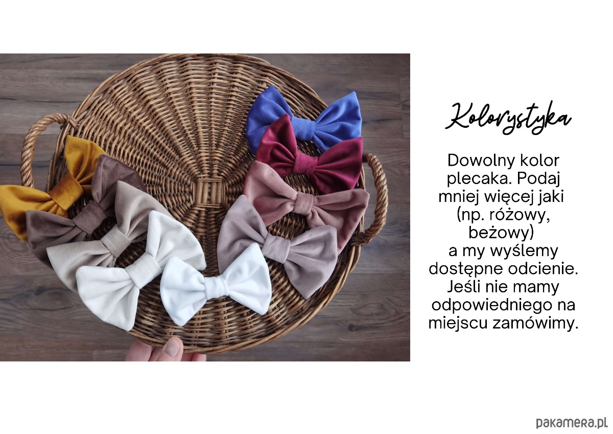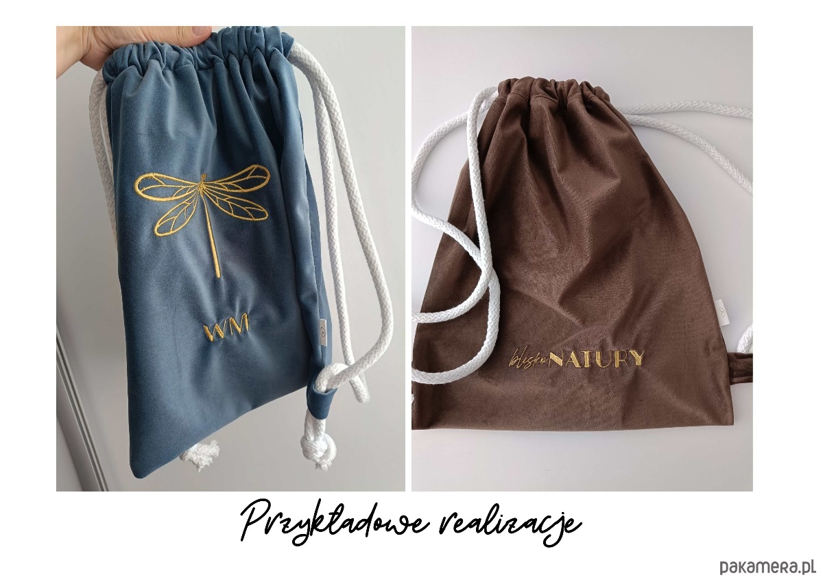 Gadżet dla każdego:) Dla najmłodszych jako plecak do żłobka, przedszkola na ubranka, zabawki, brudy, dla uczniów jako worek na wf i dla dorosłych jak podręczna torebka, plecak na rower, na basen, zakupy. Wykonany z grubej, przyjemnej w dotyku i łatwej w utrzymaniu czystości tkaniny - velvetu. Różne kolory do wyboru. Na plecaku haftujemy dowolny krótki napis, obrazek, imię. Plecak może mieć kieszonkę, uszy króliczka, misia, może być też gładki, z falbanką, z samym napisem. Jest pojemny , jego rozmiar to 40x42 cm. Wejdą do niego i buty i ubranka, zeszyty A4, drobne zakupy. Jeżeli zależy Państwu na innym rozmiarze - możemy nim minimalnie manewrować.
