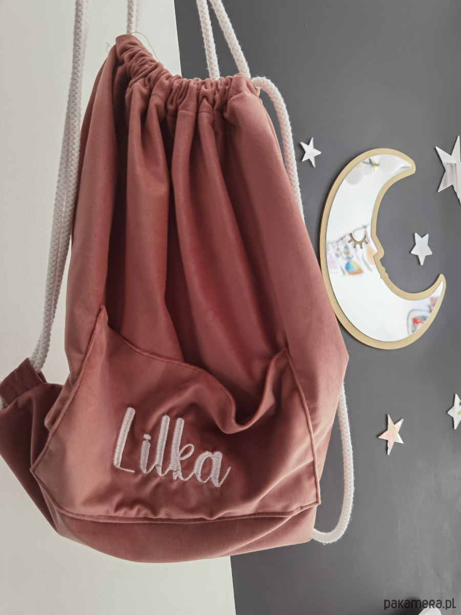 Gadżet dla każdego:) Dla najmłodszych jako plecak do żłobka, przedszkola na ubranka, zabawki, brudy, dla uczniów jako worek na wf i dla dorosłych jak podręczna torebka, plecak na rower, na basen, zakupy. Wykonany z grubej, przyjemnej w dotyku i łatwej w utrzymaniu czystości tkaniny - velvetu. Różne kolory do wyboru. Na plecaku haftujemy dowolny krótki napis, obrazek, imię. Plecak może mieć kieszonkę, uszy króliczka, misia, może być też gładki, z falbanką, z samym napisem. Jest pojemny , jego rozmiar to 40x42 cm. Wejdą do niego i buty i ubranka, zeszyty A4, drobne zakupy. Jeżeli zależy Państwu na innym rozmiarze - możemy nim minimalnie manewrować.