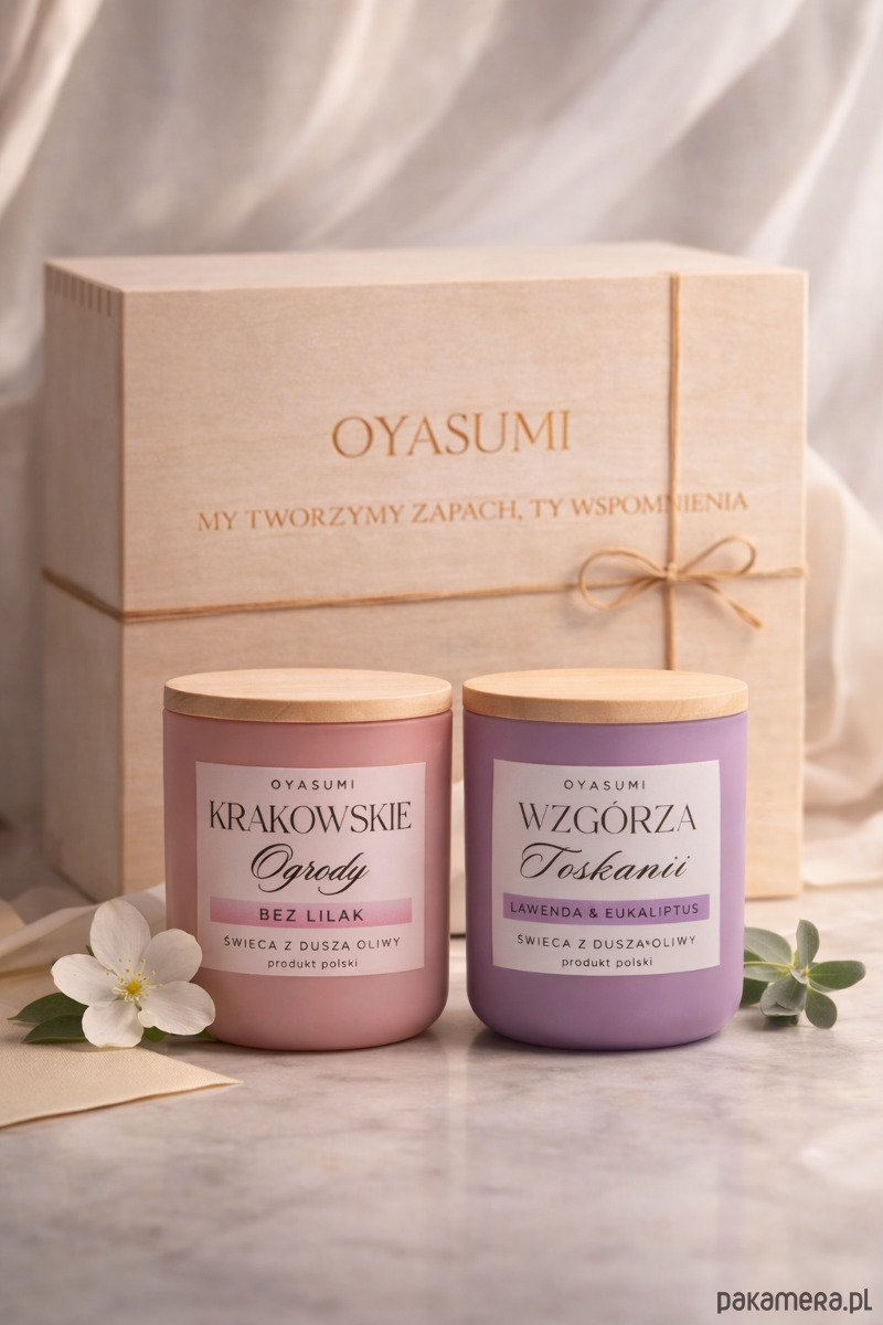 Wewnątrz eleganckiego, drewnianego pudełka z autorskim grawerem OYASUMI, odnajdziecie harmonijne połączenie dwóch zapachowych światów:
