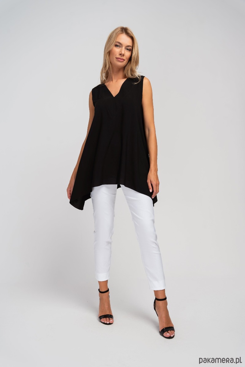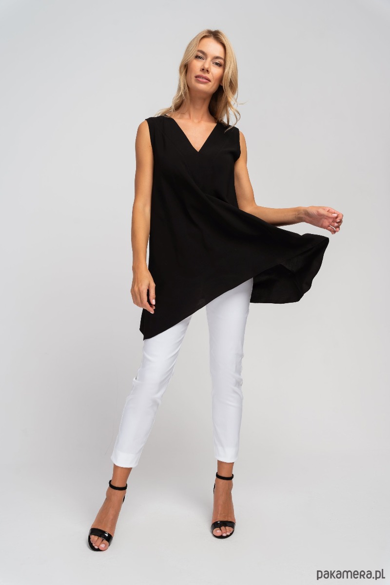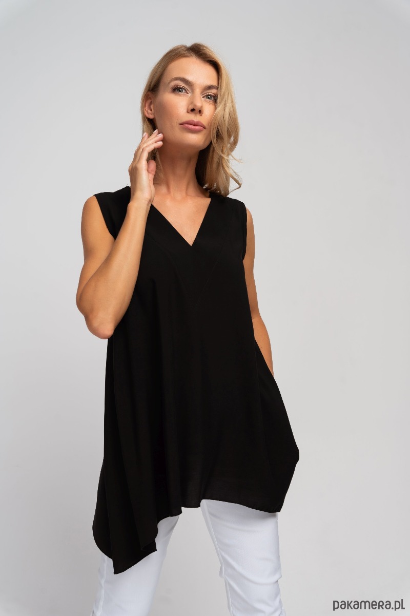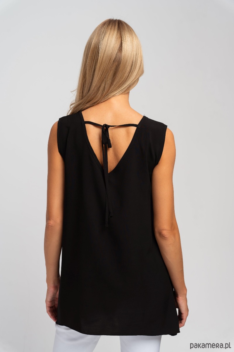 Tunika bez rękawów, z głębokim dekoltem V z przodu i z tyłu. Na karku wiązana tasiemka, która zapobiega zsuwaniu się bluzki z ramion. Przy dekolcie ozdobne przeszycie. Krój rozszerzający się ku dołowi, z wydłużonymi bokami. Zwiewny, naturalny materiał sprawdzi się na lato.
