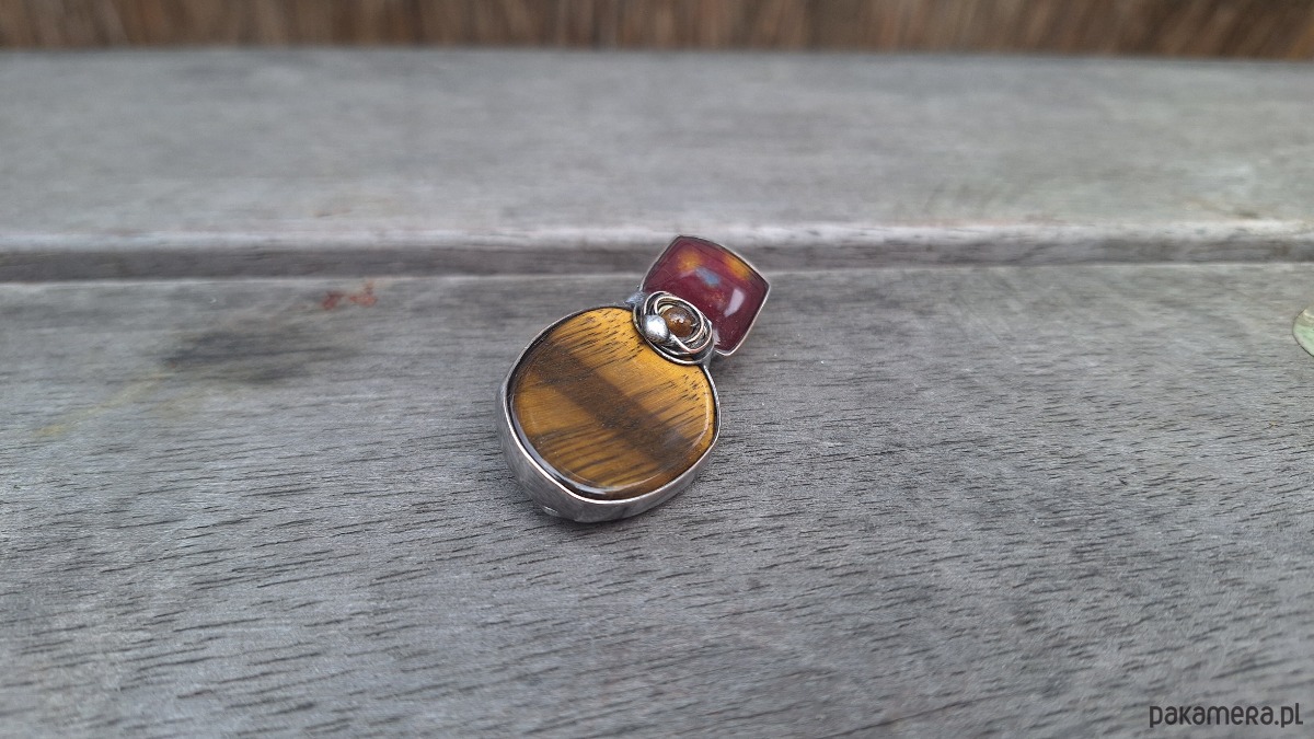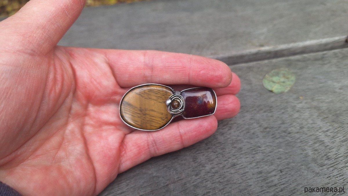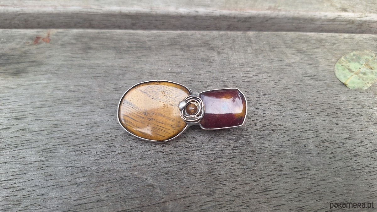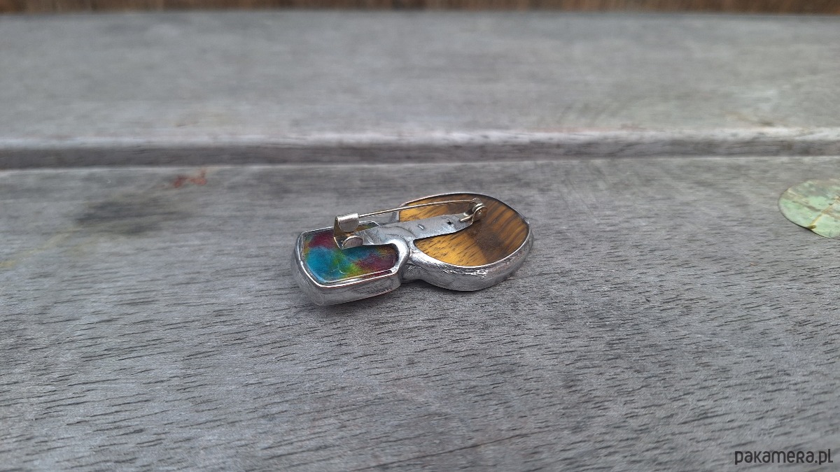 Broszka wykonana z miedzi, cyny, jaspisu i tygrysiego oka. Wymiary ok. 5 na 2 cm. Zapięcie metalowe.