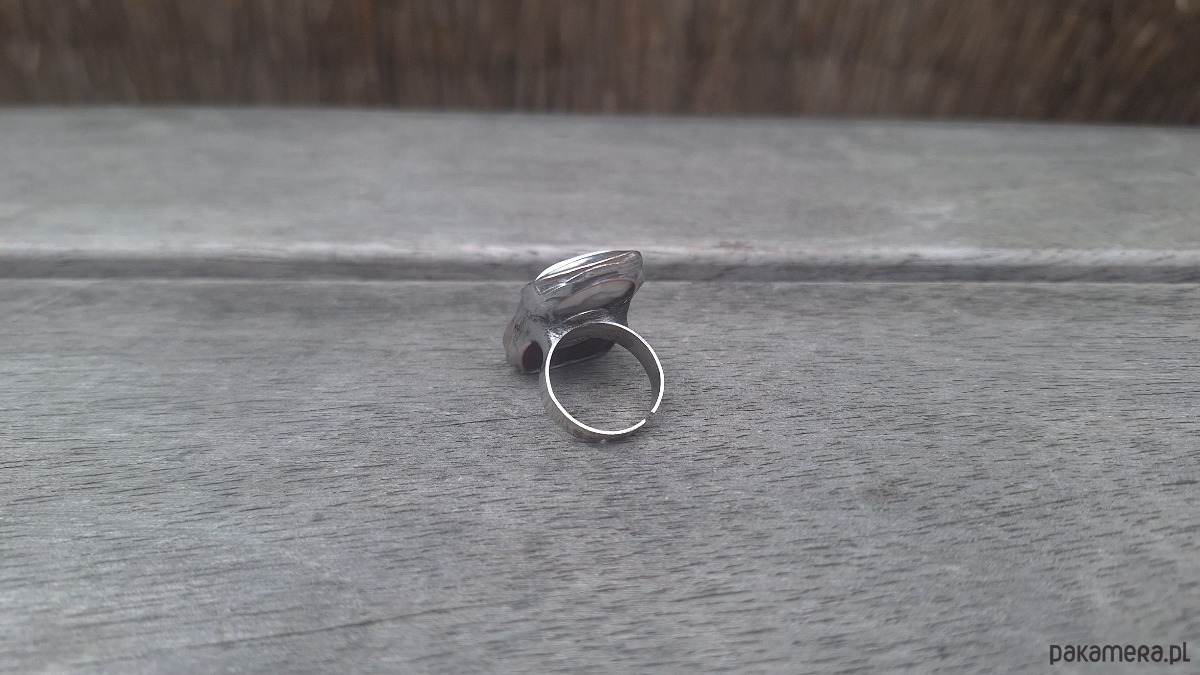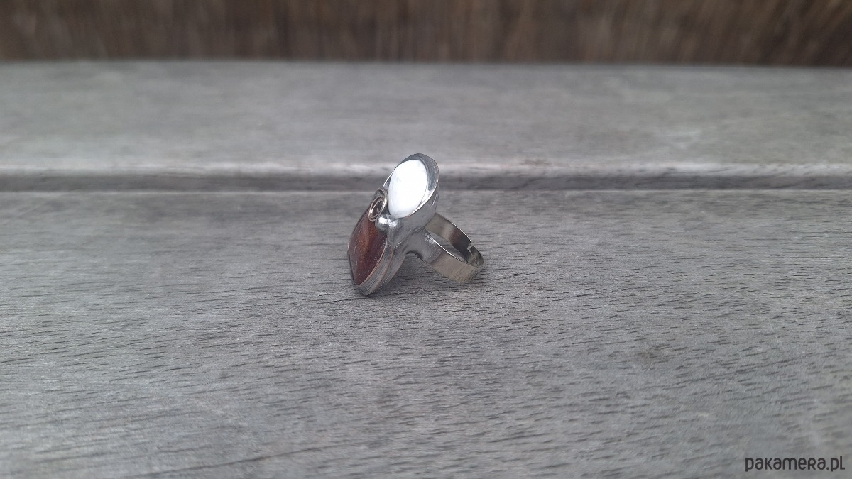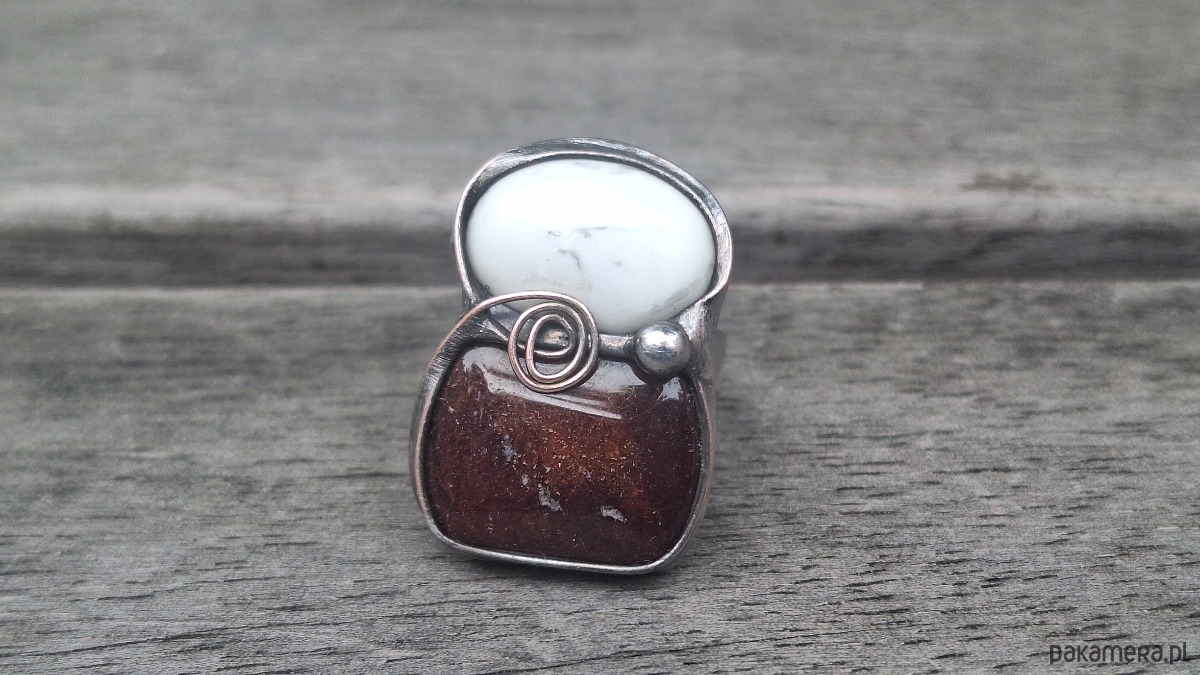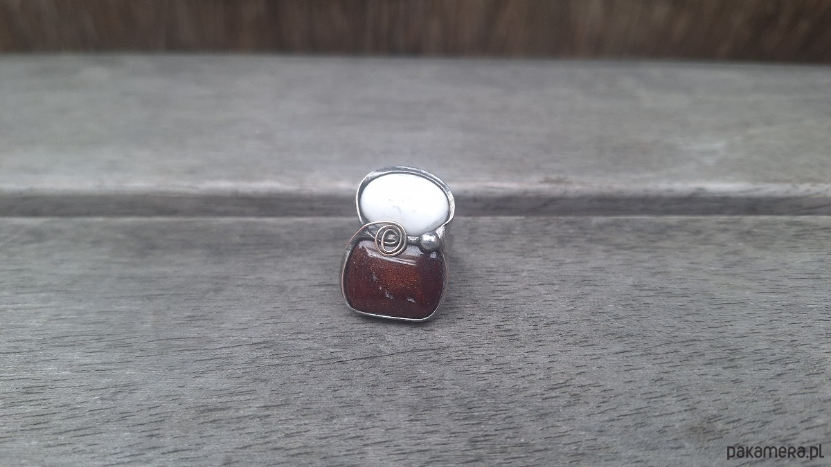 Pierścionek wykonany z miedzi, cyny, howlitu i jaspisu. Wymiary ok. 2.7 na 1.8 cm. Regulowany. Nie jest ciężki.