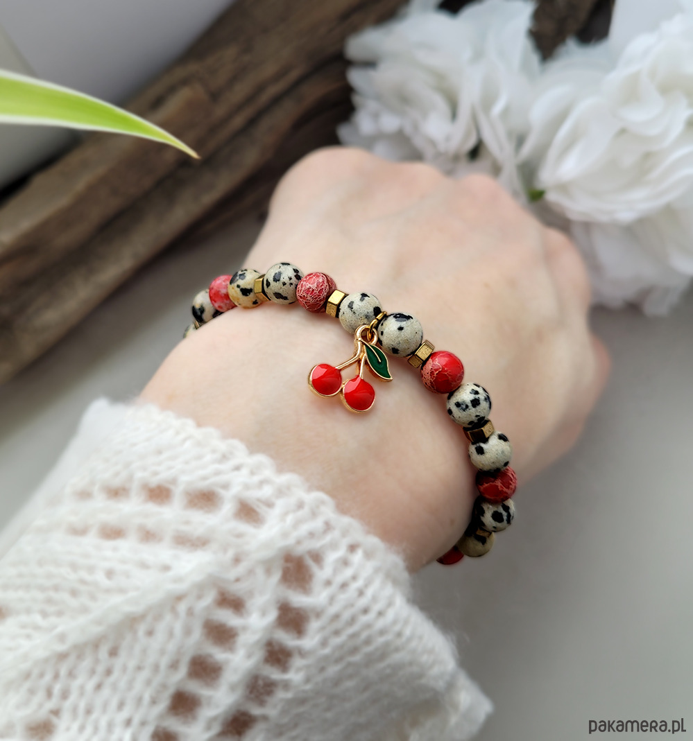Pogodna bransoletka zrobiona z kamieni naturalnych: Jaspisu Dalamtyńskiego, Karneolu oraz Hematytu w kolorze złota z wisienkami emaliowanymi.