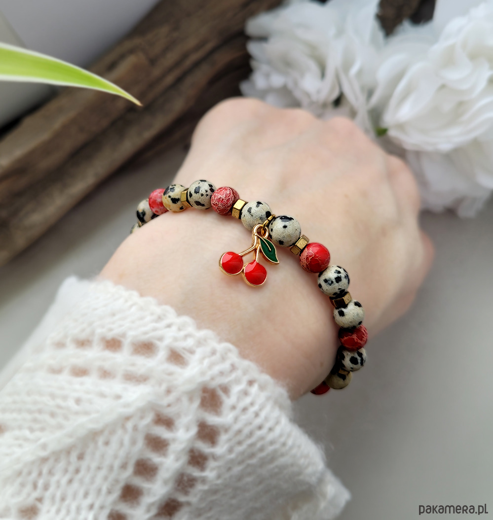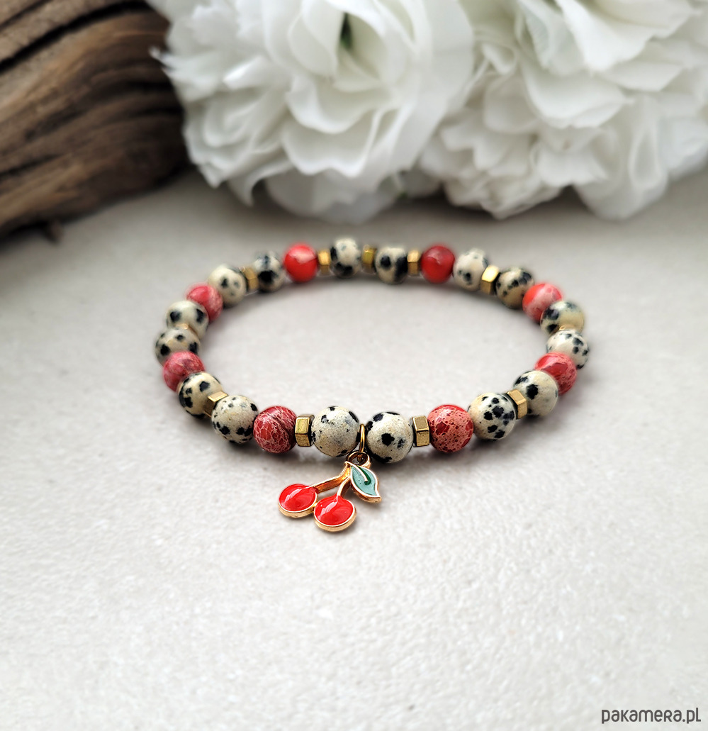 Pogodna bransoletka zrobiona z kamieni naturalnych: Jaspisu Dalamtyńskiego, Jaspisu cesarskiego oraz Hematytu w kolorze złota z wisienkami emaliowanymi.