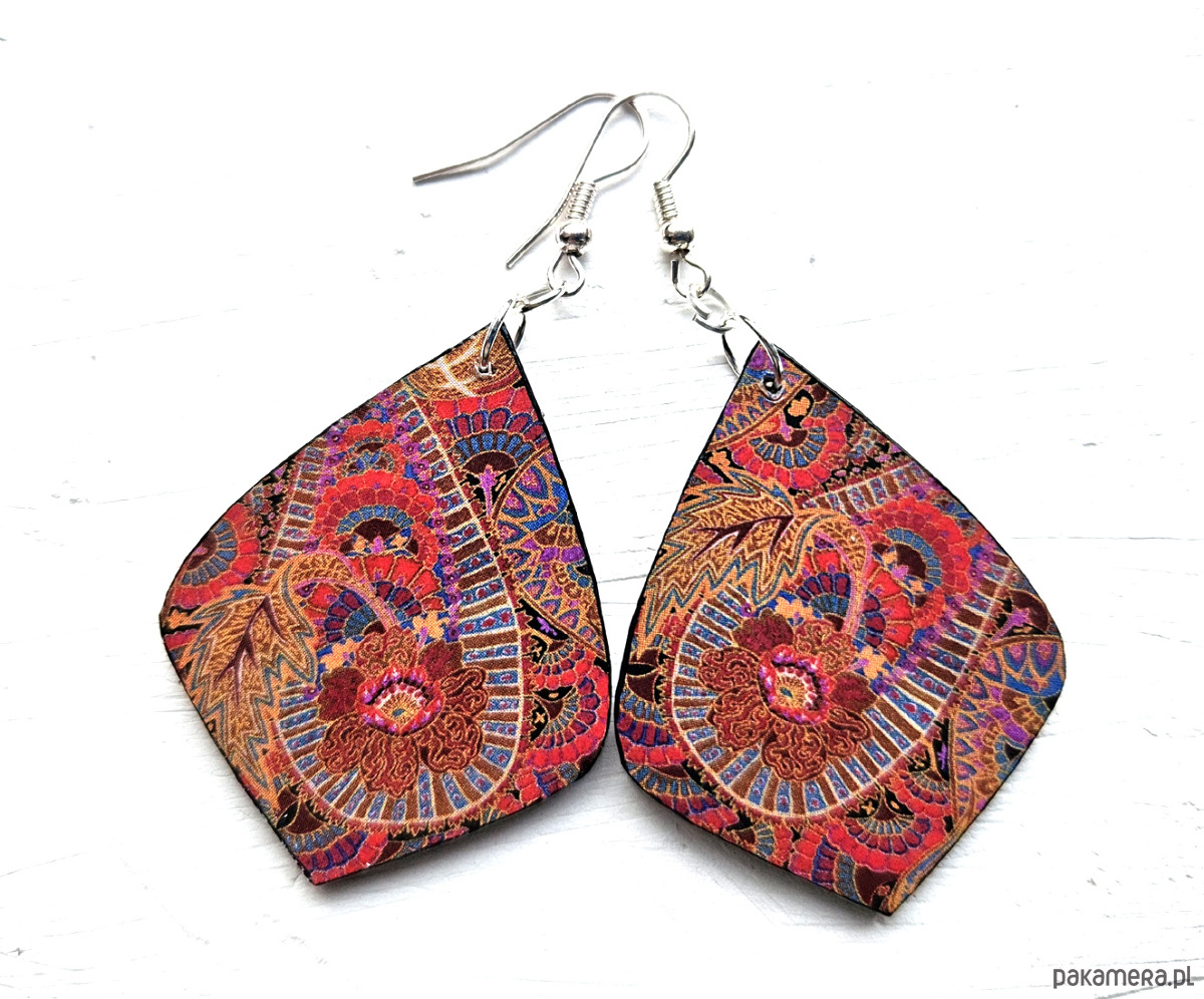 kolczyki drewniane, ozdobione metodą decoupage, dwustronne, starannie wykończone farbami akrylowymi i zabezpieczone wielokrotnie lakierem, bigle posrebrzane, długość kolczyków bez bigli: 5 cm, szerokość: 3,5 cm, bardzo lekkie