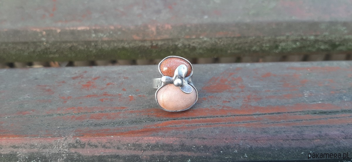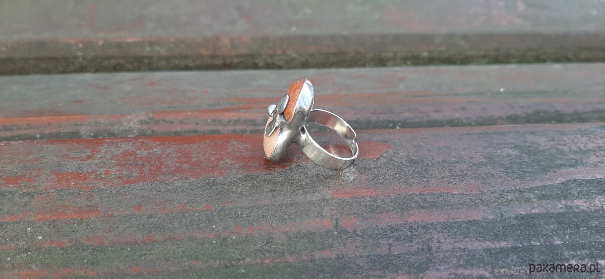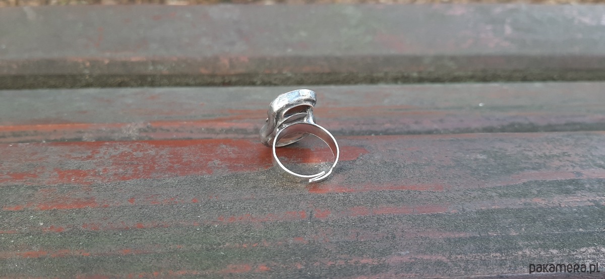 Pierścionek wykonany z miedzi, cyny, jaspisu i szkła. Wymiary ok. 2.2 na 1.7 cm. Regulowany. Nie jest ciężki.