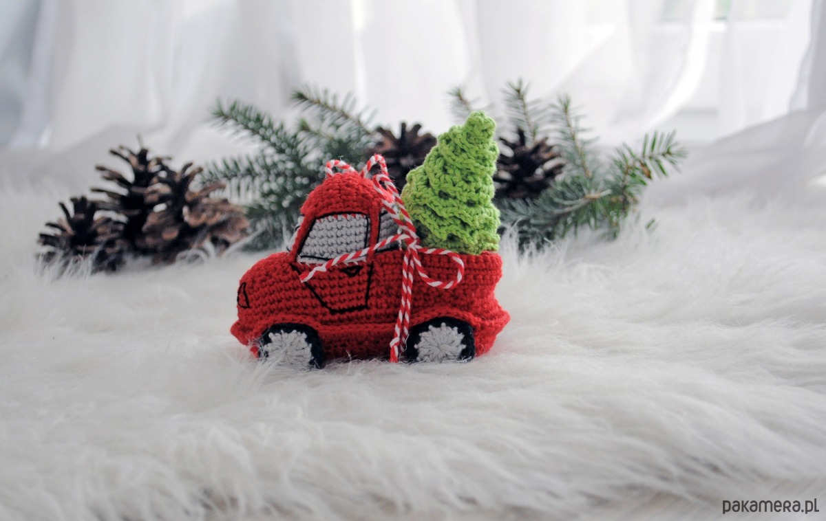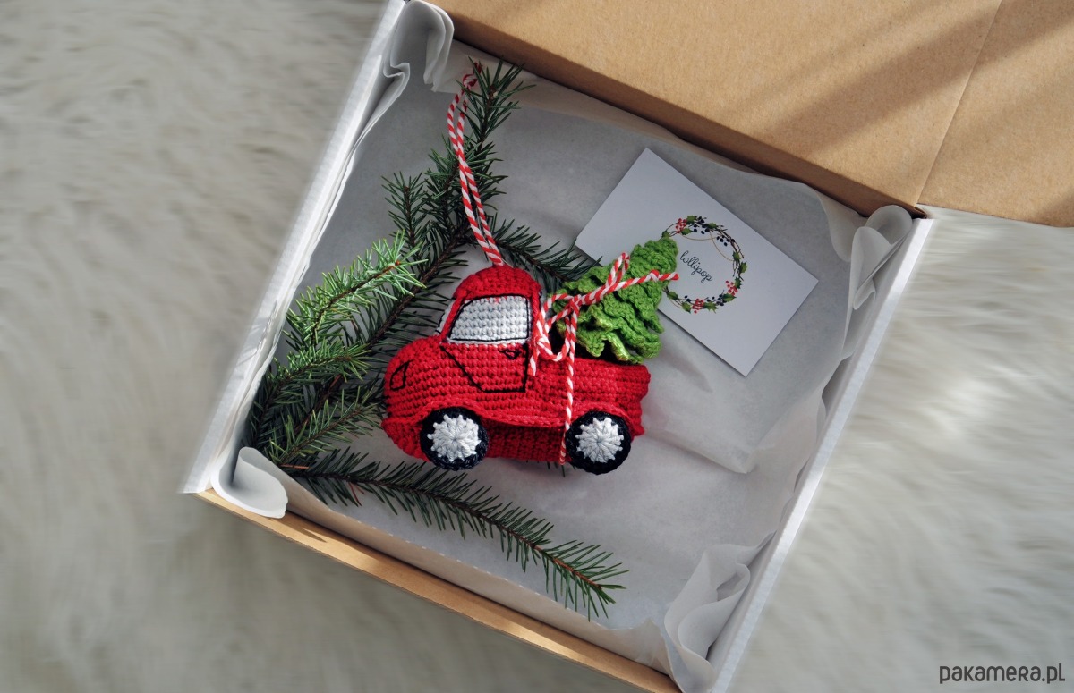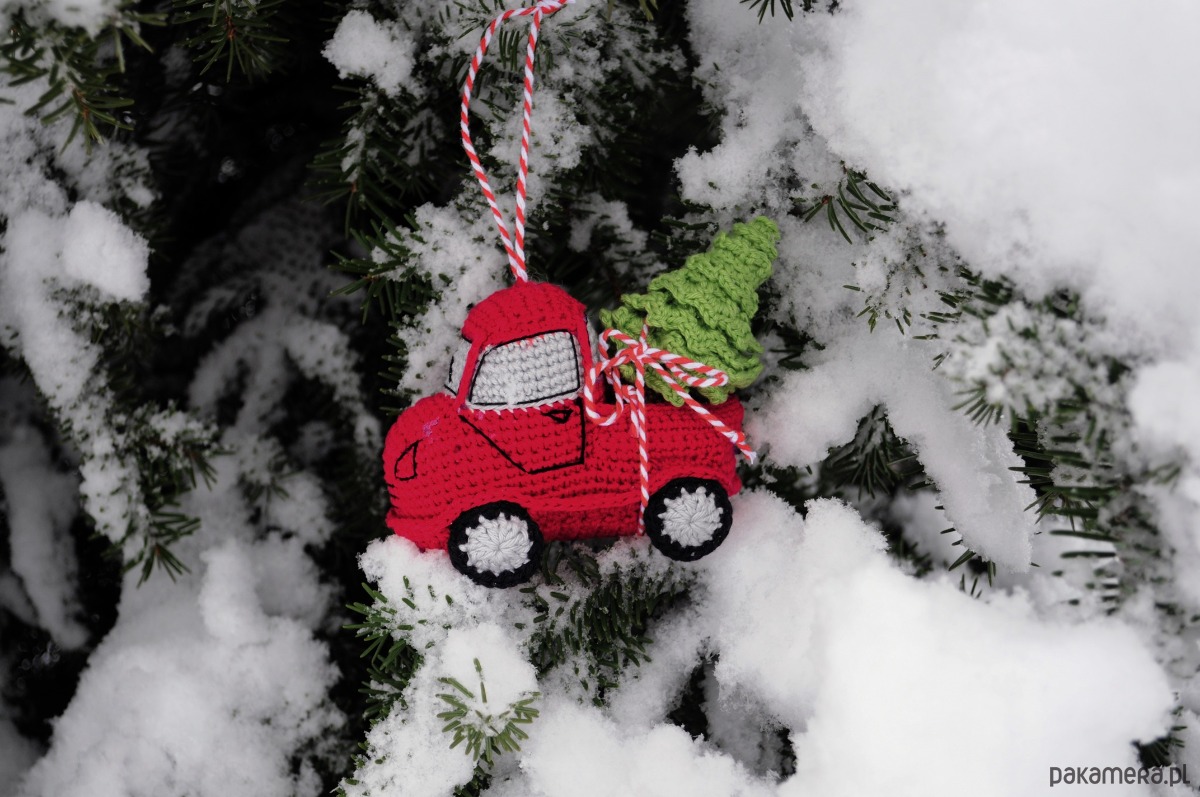Ozdoba świąteczna w charakterystycznych czerwono-zielonych barwach, składająca się z wykonanego ręcznie autka z choinką.