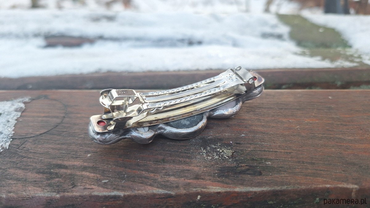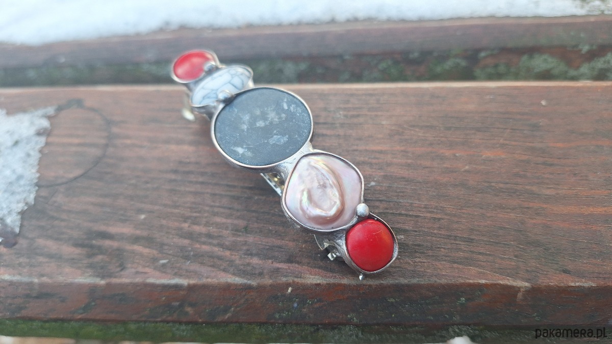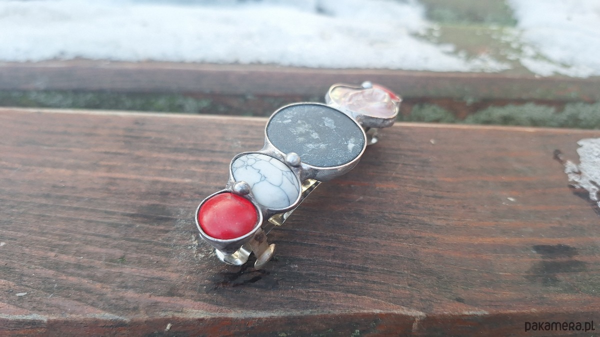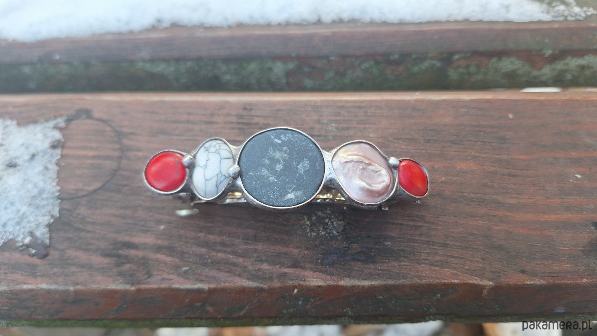 Klamra do włosów, wykonana z miedzi, cyny, agatu, perły i howlitów. Wymiary ok. 8 na 2.3 cm. Zapięcie 6 cm, metalowe.