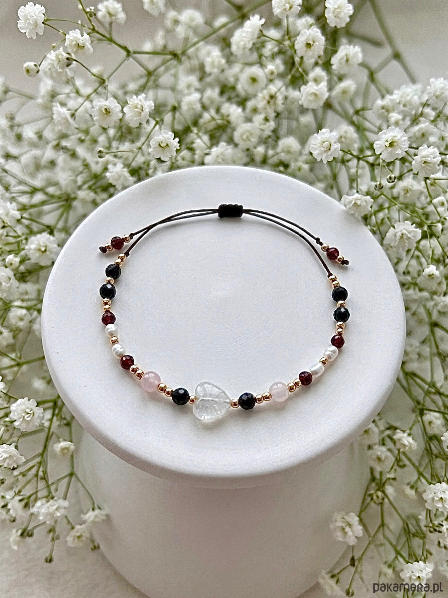 Piękna bransoletka na sznurku z kamieniami agat, granat, perły
