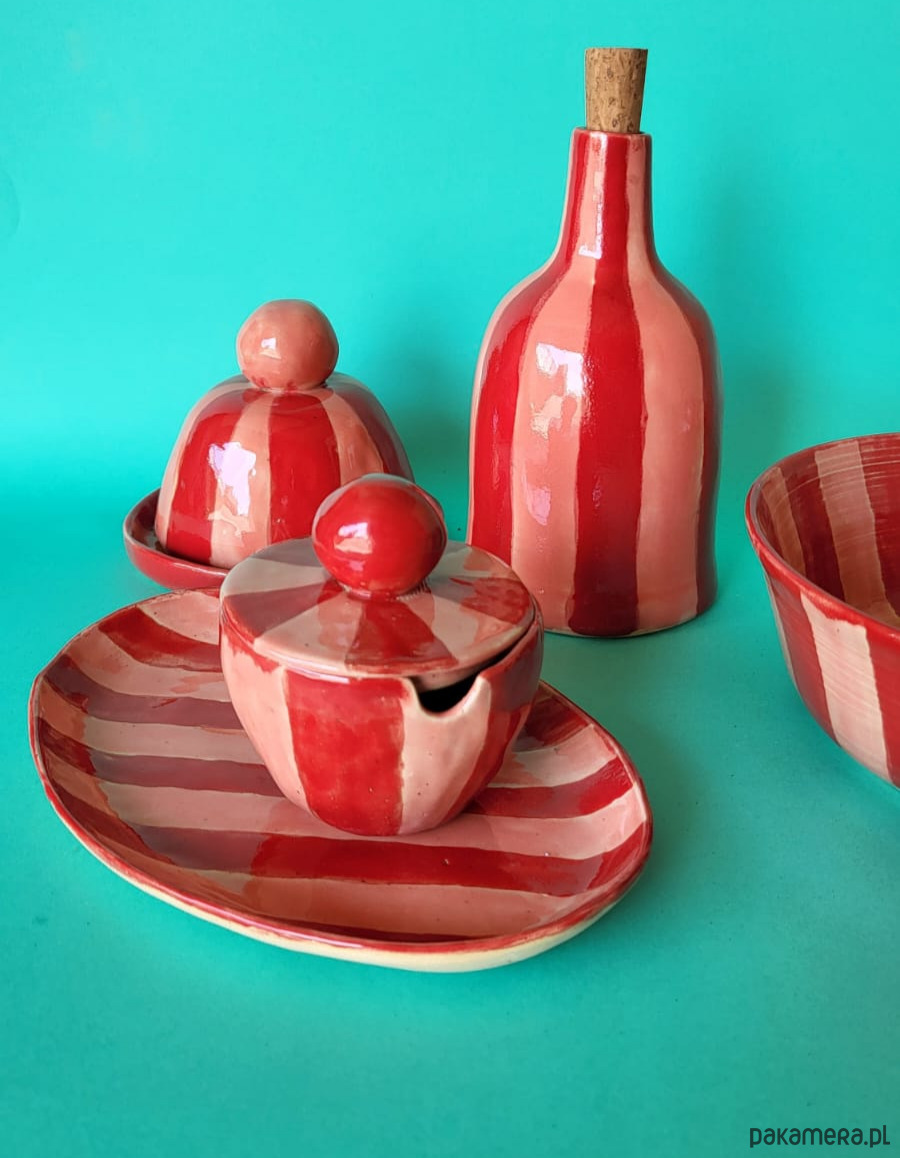 Ręcznie robiona ceramika do codziennego użytku — Piękna, ceramiczna cukiernica - pojemnik różowo czerwony