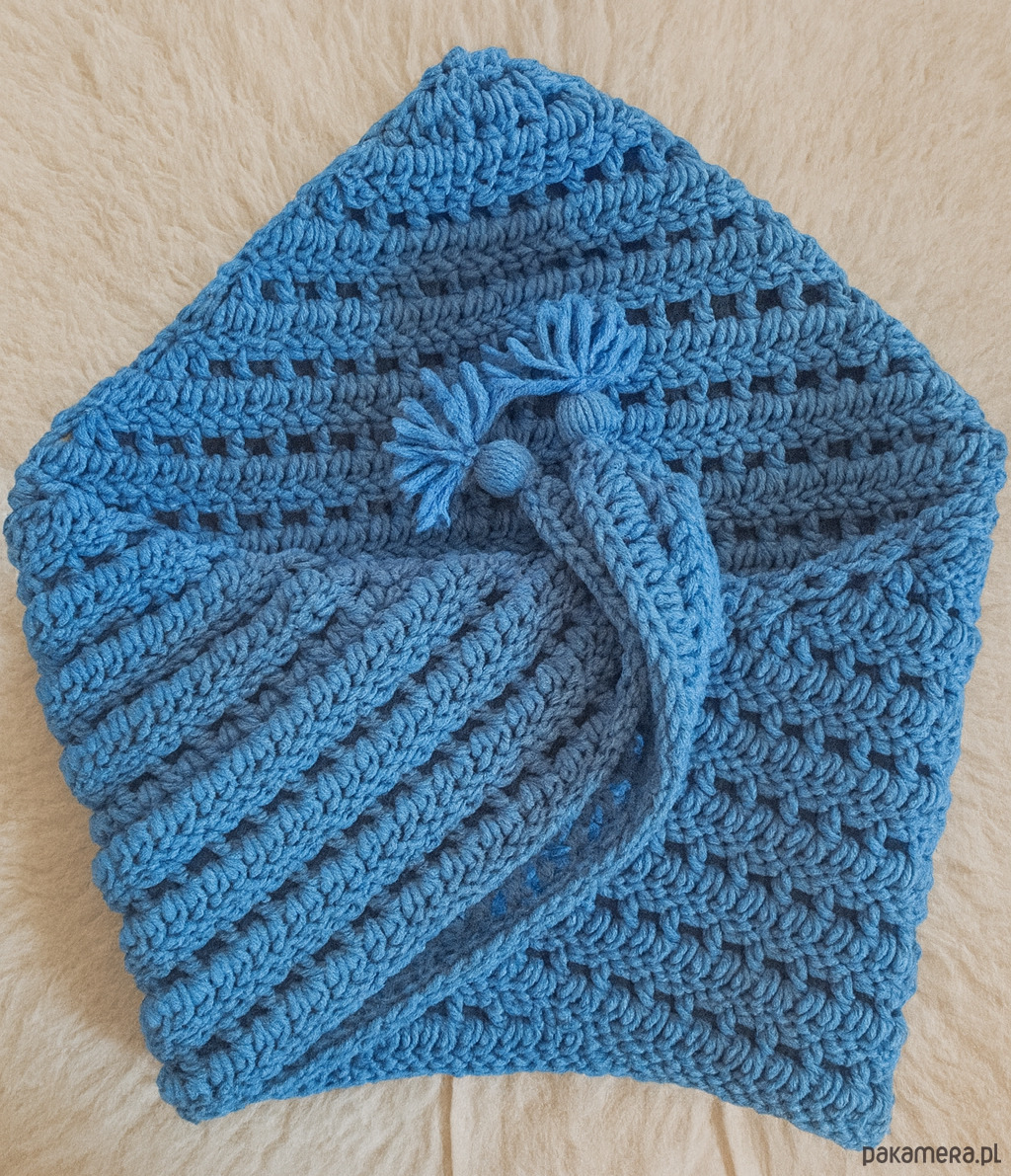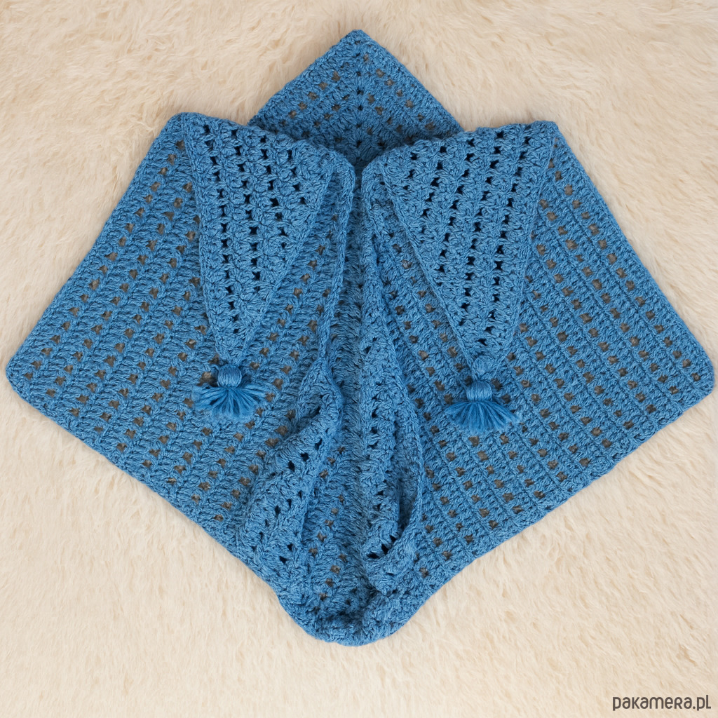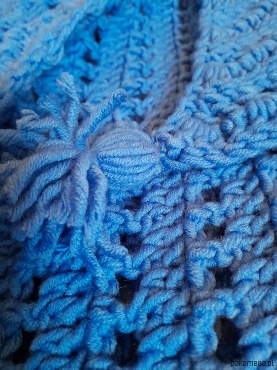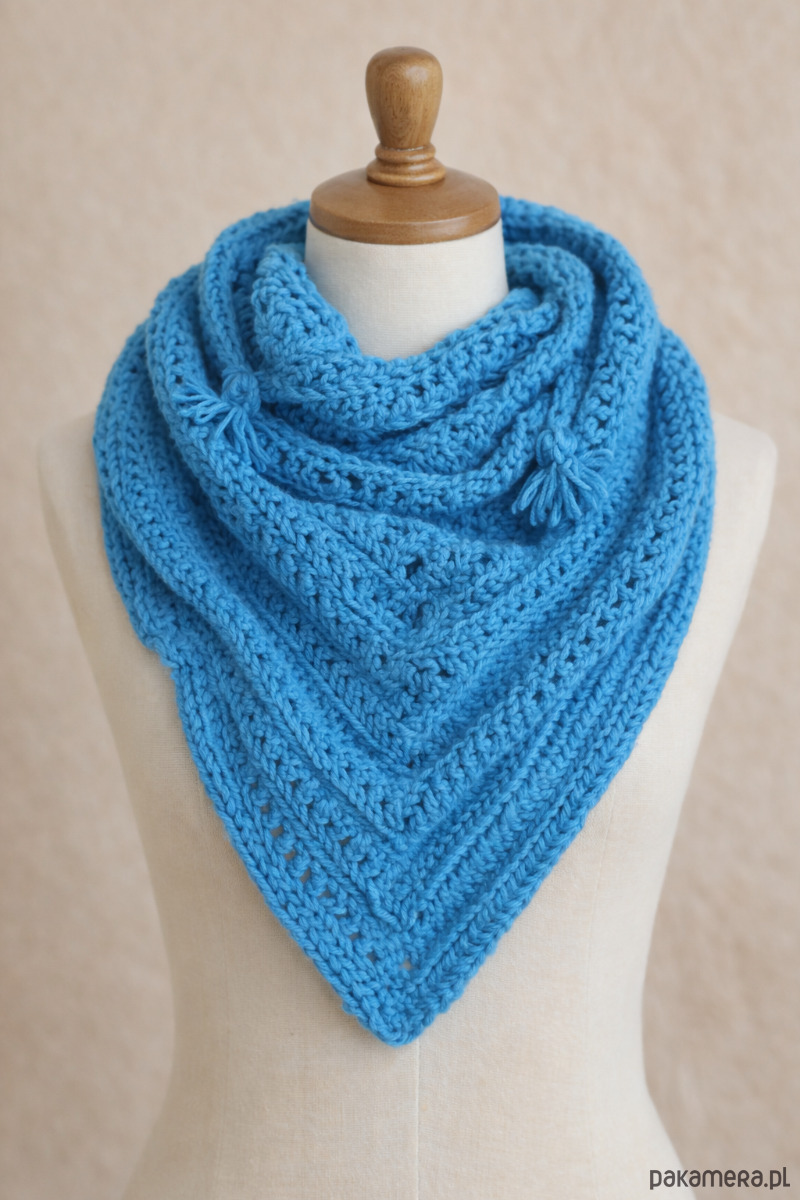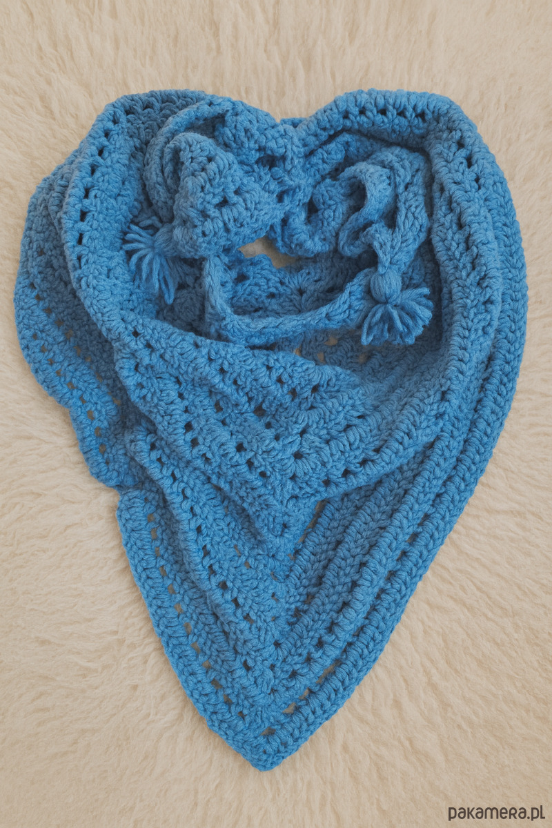 Szydełkowa chusta wykonana z włóczki yarn art merino bulky. Bardzo gruba i bardzo ciepła. Doskonała na wieczory jesienne i zimowe.. Długość najdłuższego boku 210 bez rozciągania cm; Przepiękny chabrowy kolor. Gorąco polecam. Dla babci, mamy, siostry, koleżanki.