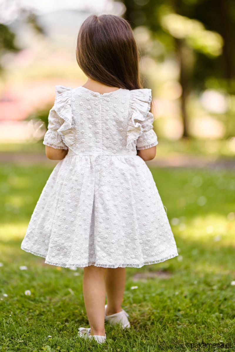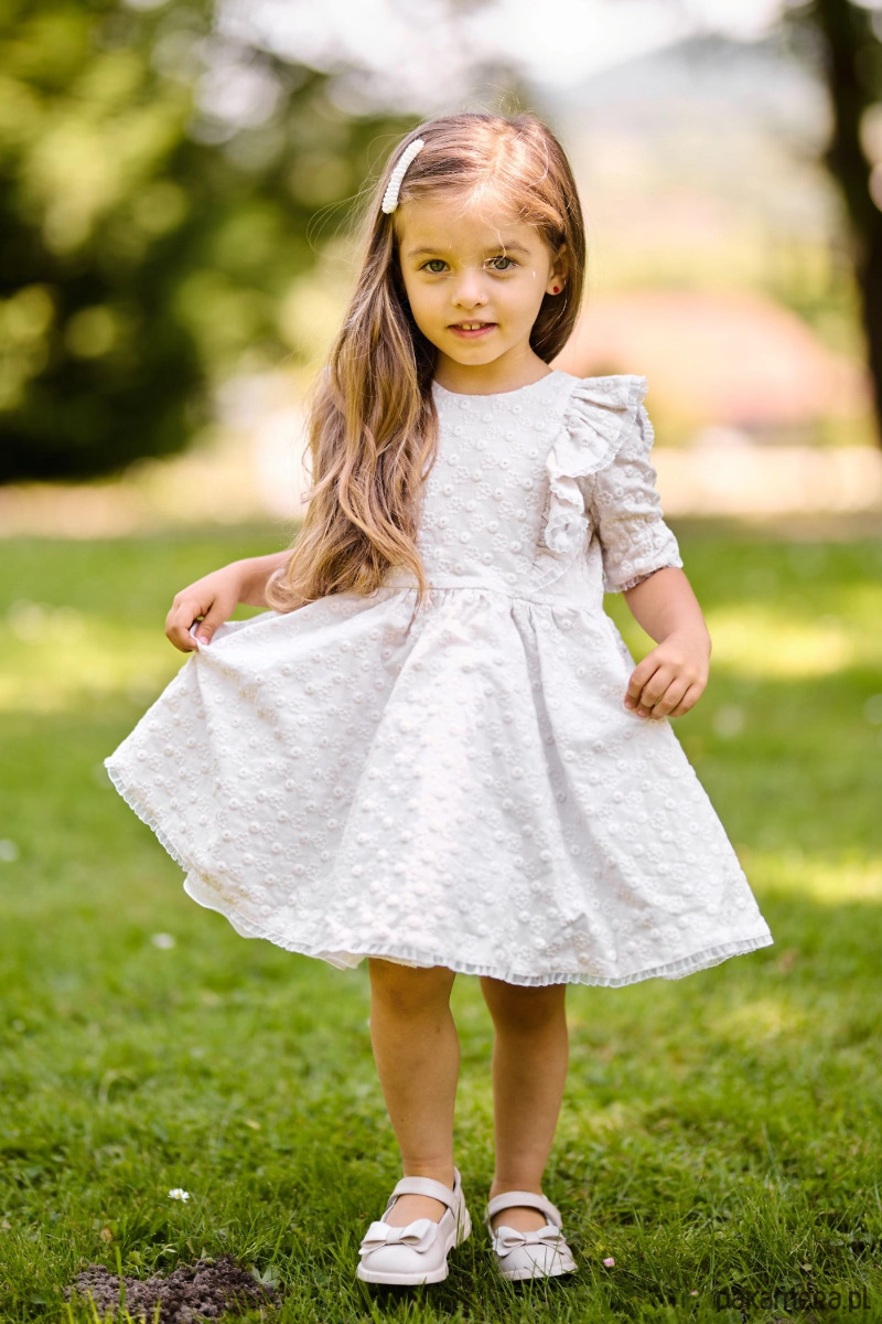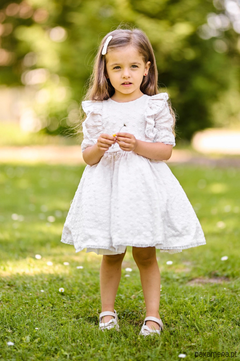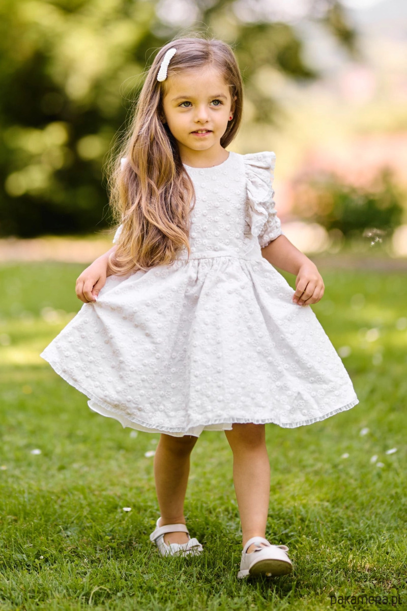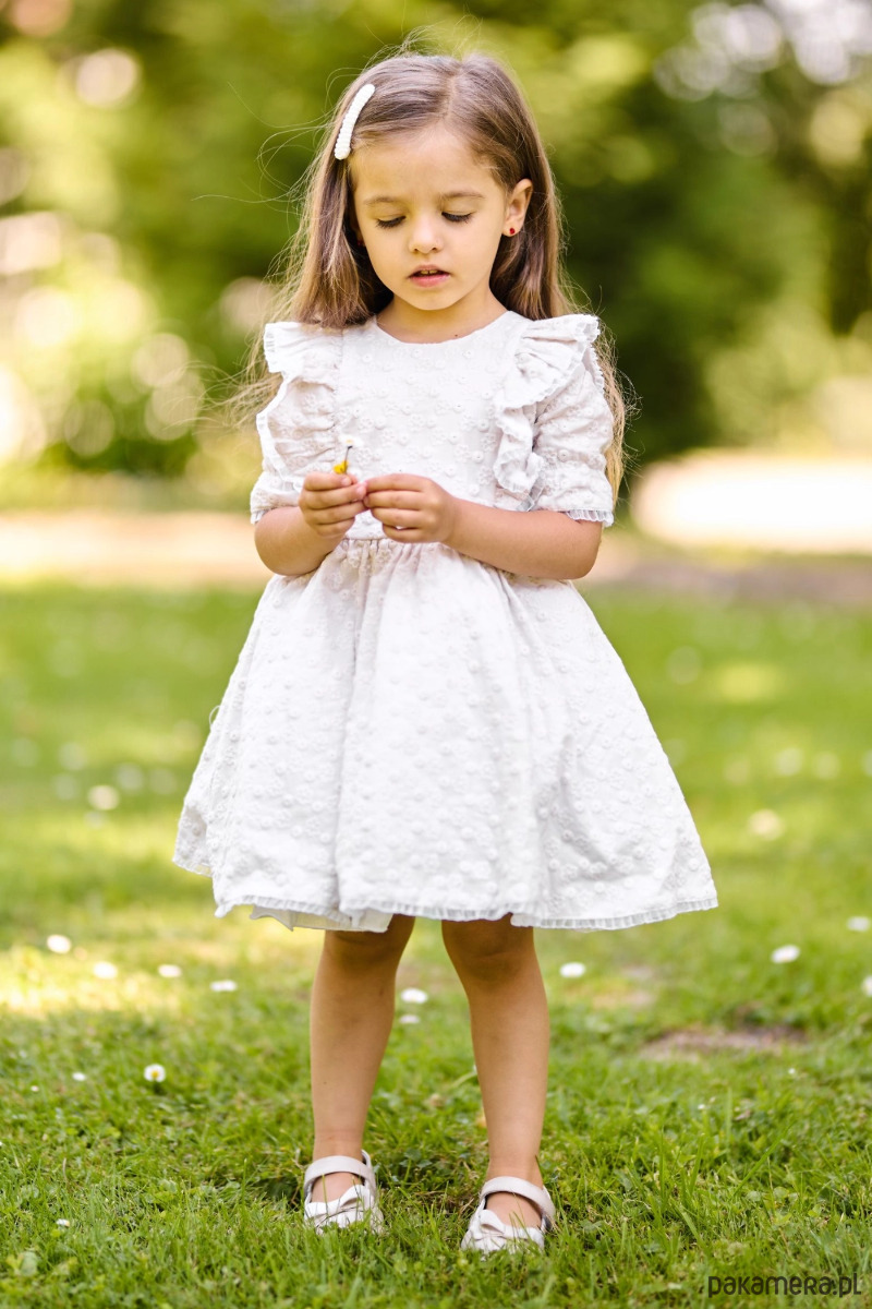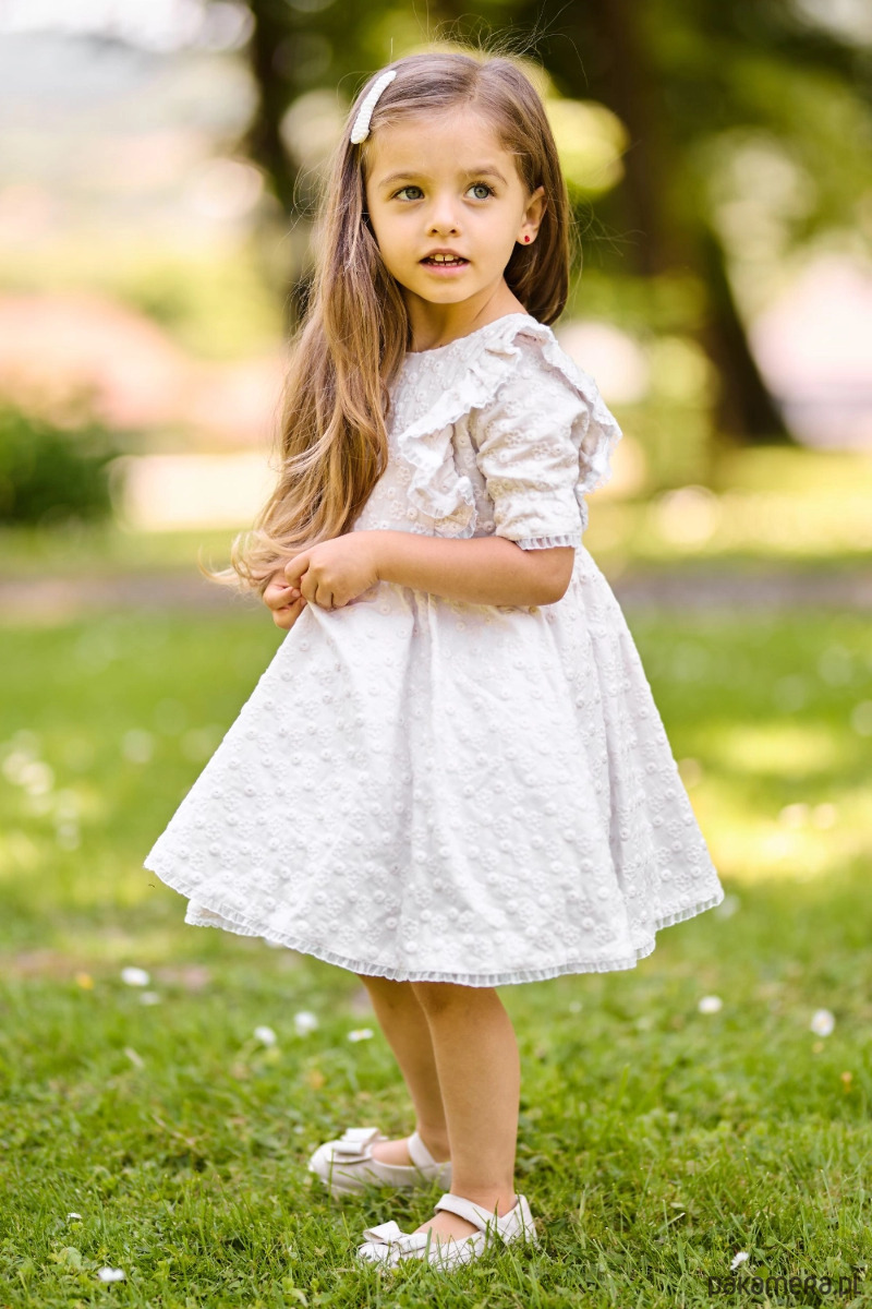 Elegancka sukienka wykonana z najwyższej jakości muślinu, ozdobiona subtelnym haftem w drobne kwiatuszki, zachwyca lekkością i romantycznym charakterem. Urocze falbanki wykończone koronką nadają jej wyjątkowej finezji, a miękka, batystowa podszewka zapewnia komfort noszenia nawet w ciepłe dni.