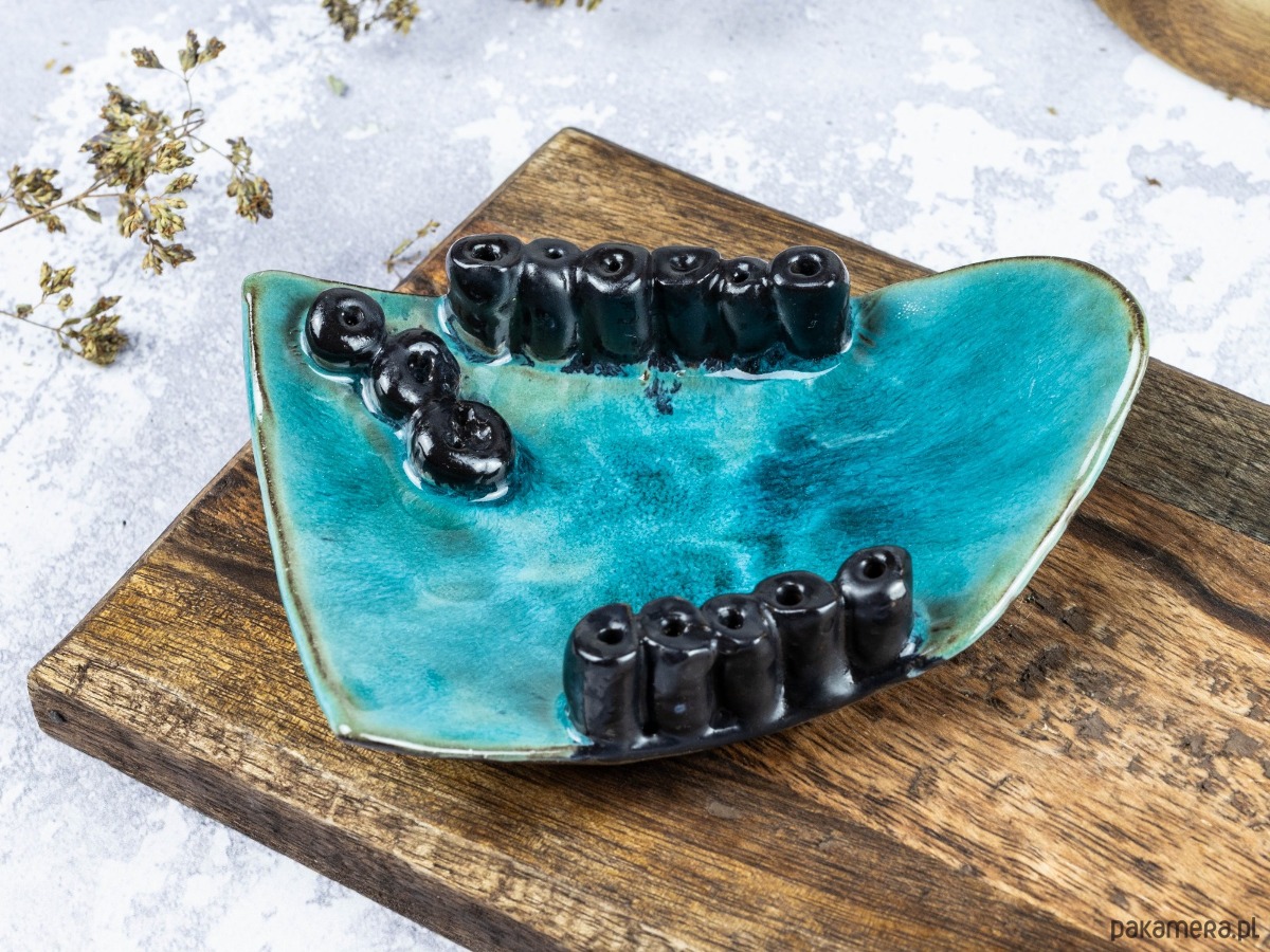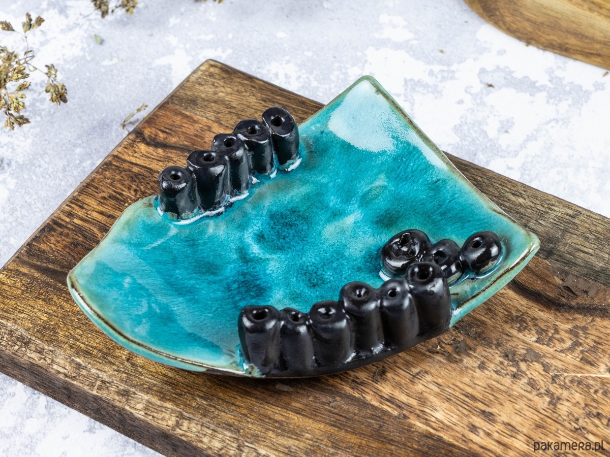 Ręcznie wykonany, z turkusowym szkliwem i wzorem, który przywodzi na myśl rafę koralową albo sen o urlopie, który trwał dokładnie trzy dni za krótko.