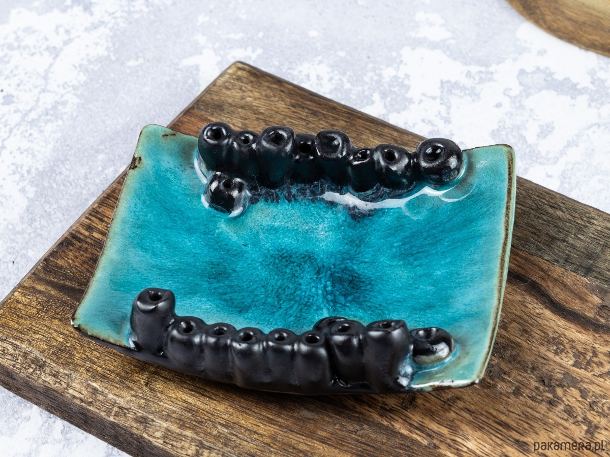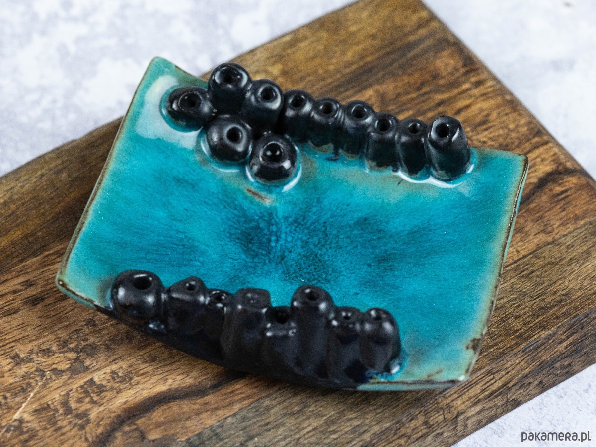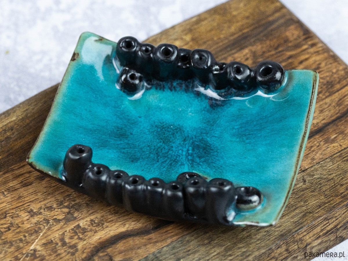 Wymiary 11,5 x 9 x 3 cm, a osobowość nie do podrobienia. Ręcznie wykonany, z turkusowym szkliwem i wzorem, który przywodzi na myśl rafę koralową albo sen o urlopie, który trwał dokładnie trzy dni za krótko.