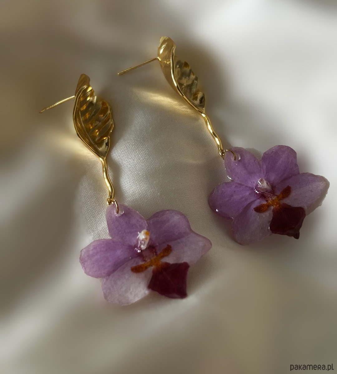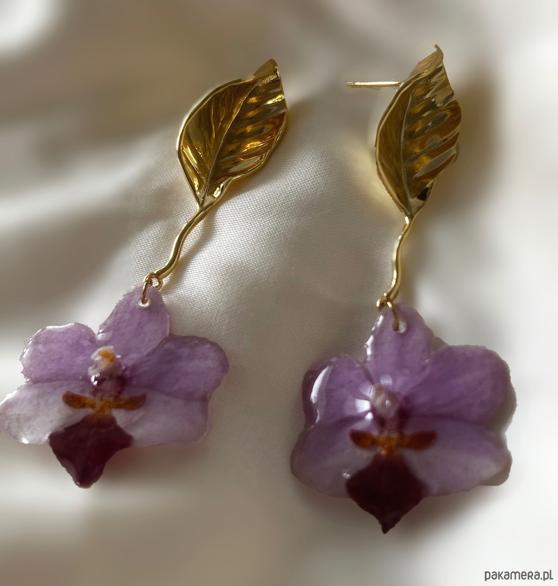 Te wyjątkowe kolczyki powstały z prawdziwych, delikatnych storczyków, zatopionych w żywicy tak, aby zachować ich naturalną formę, kolor i niepowtarzalne detale. Liliowo–fioletowe płatki tworzą kobiecy, eteryczny akcent, który pięknie odbija światło i dodaje twarzy świeżości.
