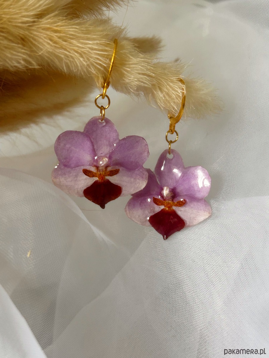 Te wyjątkowe kolczyki powstały z prawdziwych, delikatnych storczyków, zatopionych w żywicy tak, aby zachować ich naturalną formę, kolor i niepowtarzalne detale. Liliowo–fioletowe płatki tworzą kobiecy, eteryczny akcent, który pięknie odbija światło i dodaje twarzy świeżości.