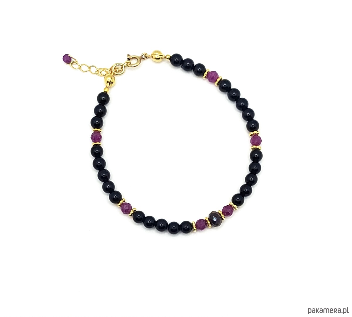 Delikatna, elegancja bransoletka. Wykonana z gładkich kul turmalinu, na których czarnym tle można podziwiać rubiny otoczone złoconymi przekładkami. Rubiny są w kształcie oponek, dzięki fasetowaniu błyszczą wzmacniając szykowny wygląd tej bransoletki. W mocno intensywnym odcieniu.