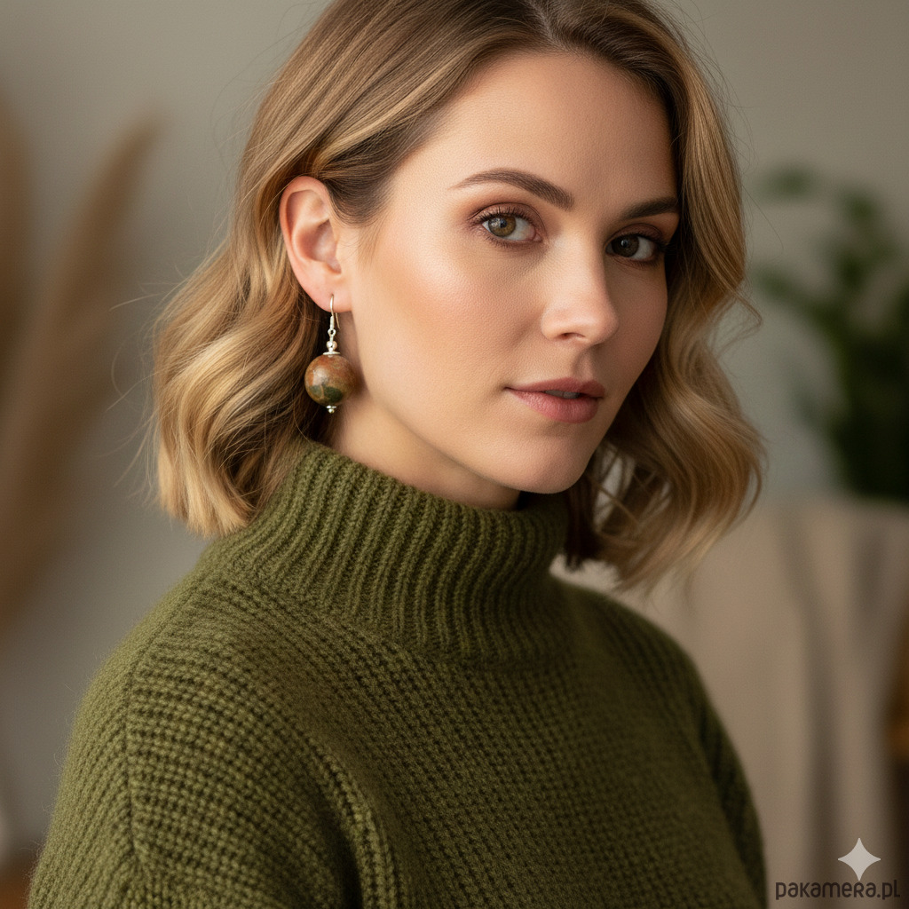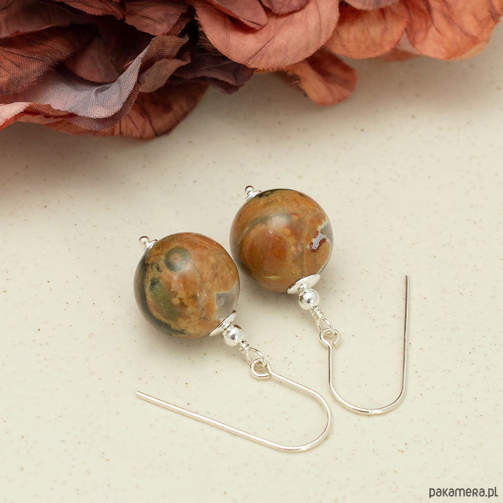 Te piękne kolczyki wykonane są ze srebra próby 925 i dużych kulek jaspisu krajobrazowego.