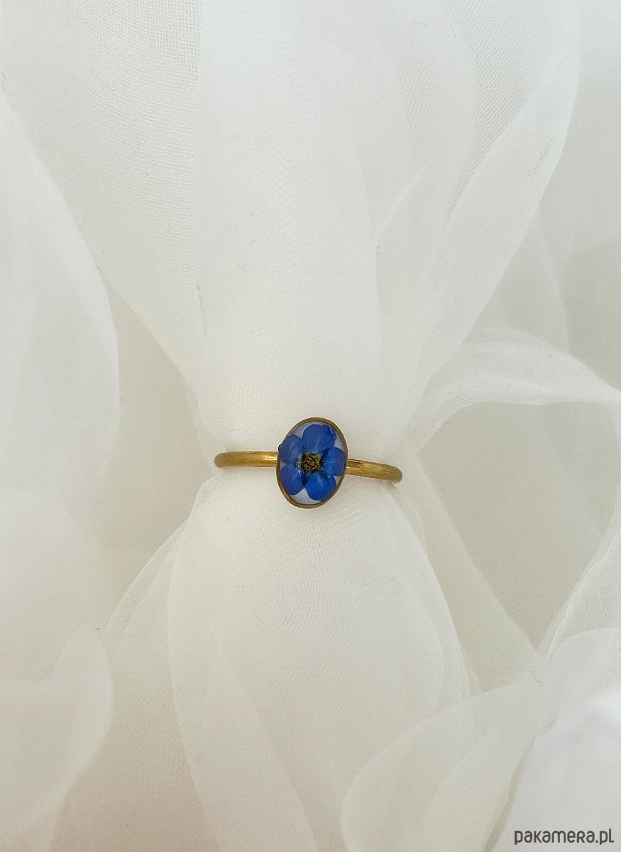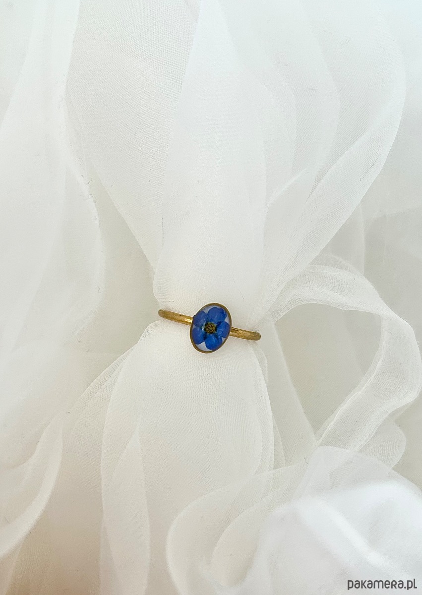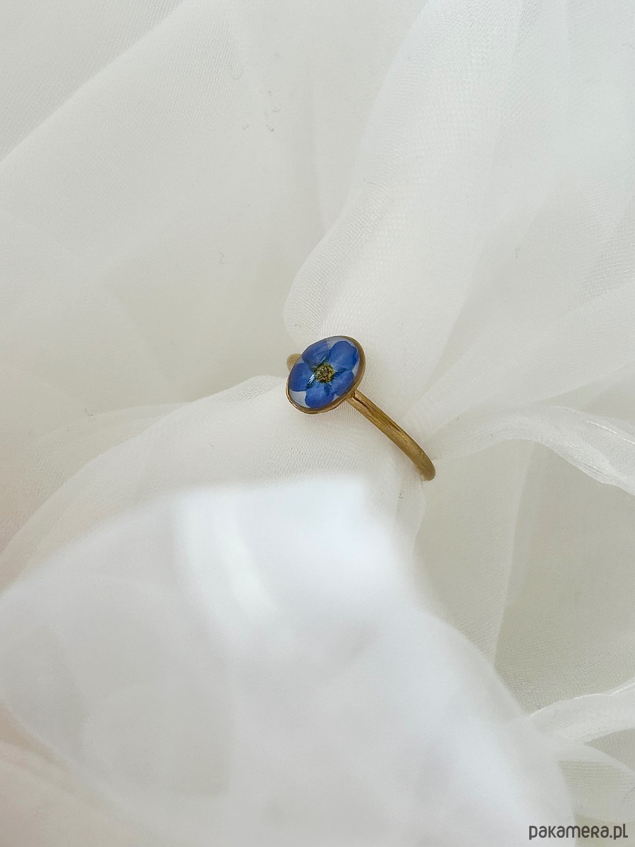 Ten subtelny pierścionek to kwintesencja romantyzmu i ponadczasowego piękna. W jego centrum umieściliśmy prawdziwy, starannie wyselekcjonowany kwiatek niezapominajki, który został zatopiony w krystalicznie przejrzystej żywicy. Dzięki temu, jego intensywny, błękitny kolor pozostanie z Tobą na zawsze, niezależnie od pory roku.