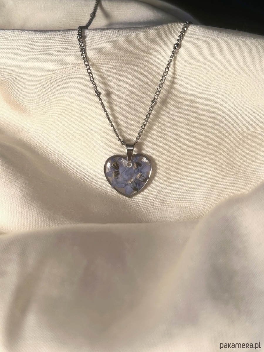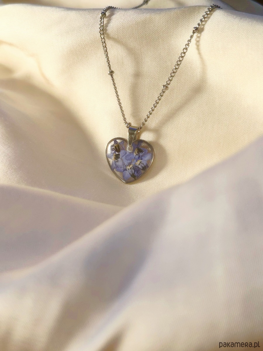 Piękny naszyjnik z niezapominajkami zamkniętymi w posrebrzanym serduszku na ozdobnym łańcuszku.