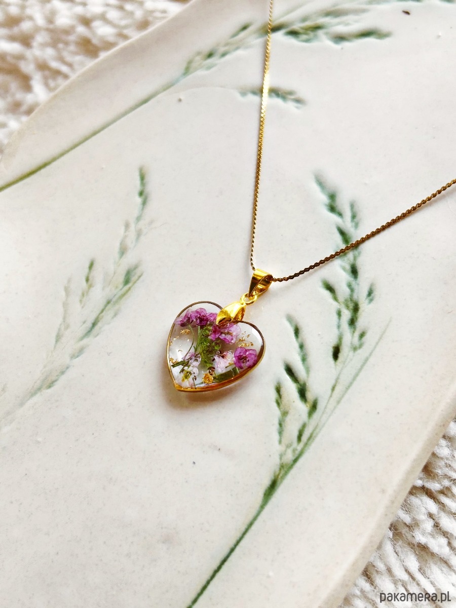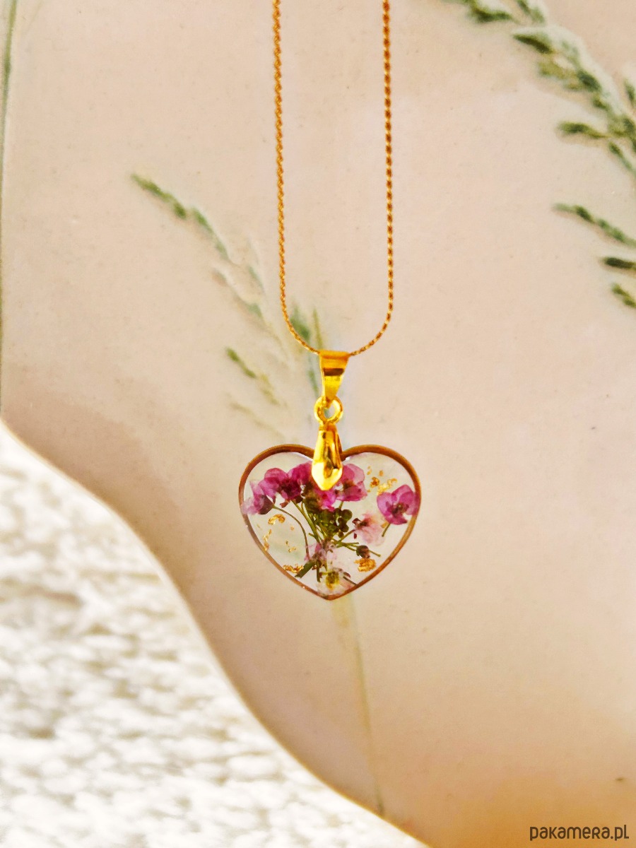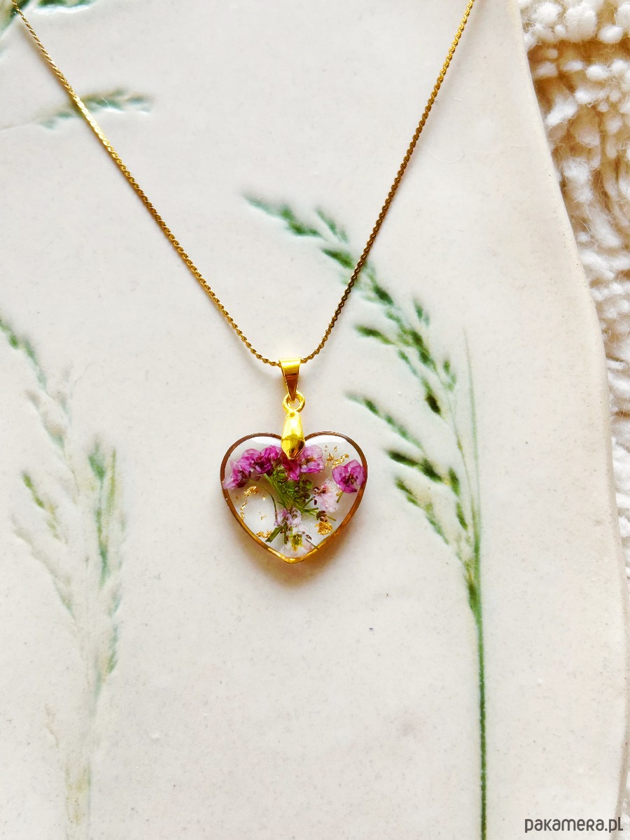 Piękny naszyjnik serce z kwiatami zamkniętymi w żywicy