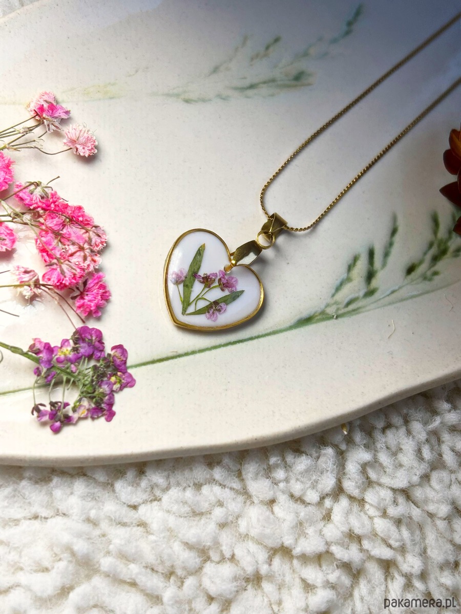Ten subtelny naszyjnik z prawdziwymi kwiatami smagliczki zatopionymi w mlecznej żywicy to biżuteria, która zachwyca delikatnością i romantycznym charakterem. Różowo-fioletowe płatki układają się w naturalny, kwiecisty motyw, tworząc efekt jak z botanicznej ilustracji.
