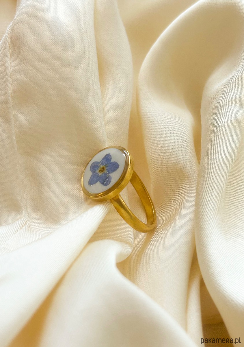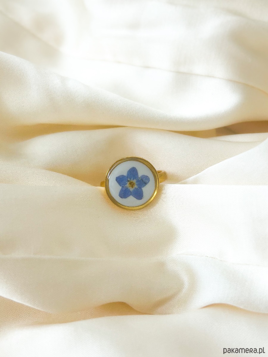 Regulowany pierścionek z zamkniętą obrączką z prawdziwą niezapominajką zatopioną w krystalicznej zywicy.