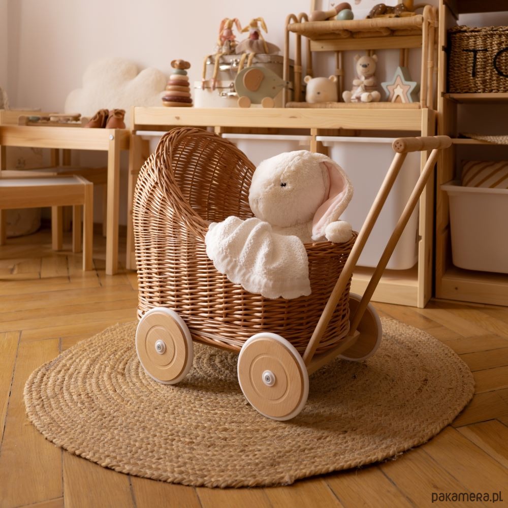 Wiklinowy wózek dla lalek został zrobiony z najwyższego gatunku wikliny, która pochodzi tylko z polskich gospodarstw. Taki wózek to świetna zabawka, ponieważ jest bezpieczna dla najmłodszych oraz zapewnia fantastyczną zabawę przez długi czas. Produkty z wikliny to artykuły ekologiczne, które nie zagrażają środowisku, a ponadto są trwałe, odporne na uszkodzenia mechaniczne. Natomiast sama wiklina posiada właściwości wodoodporne. Drewniane kółka umożliwiają jeżdżenie i dodają walorów estetycznych. Taki wózek stanowi również doskonałą ozdobę do pokoju małej dziewczynki.