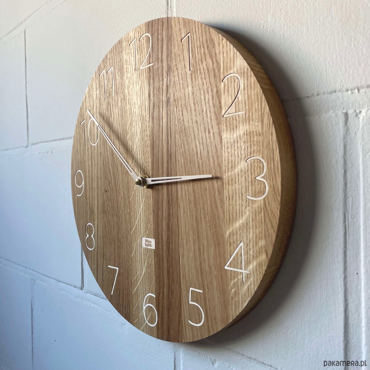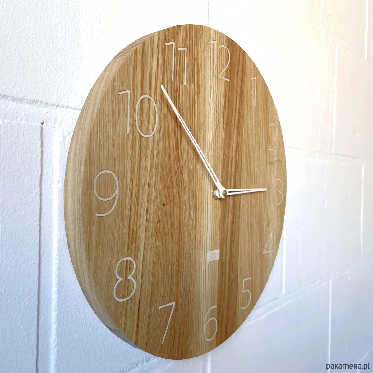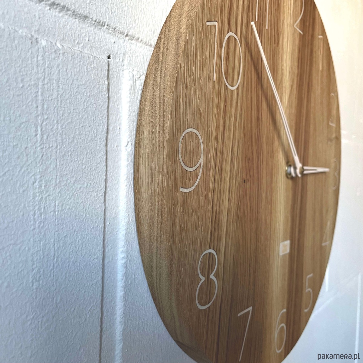 Zegar ścienny wykonany z drewna ze smukłymi cyframi i specjalnie zaprojektowanymi smukłymi wskazówkami. Wygląda lekko i nowocześnie.