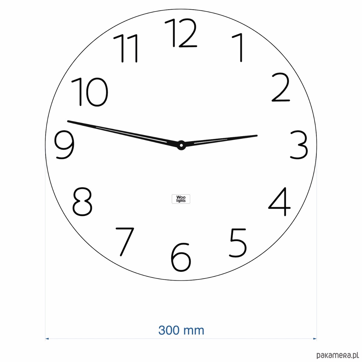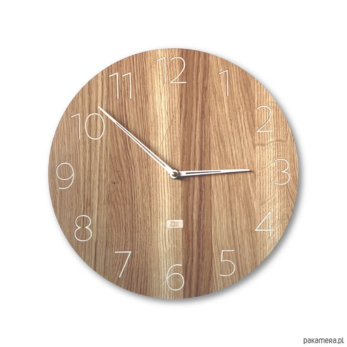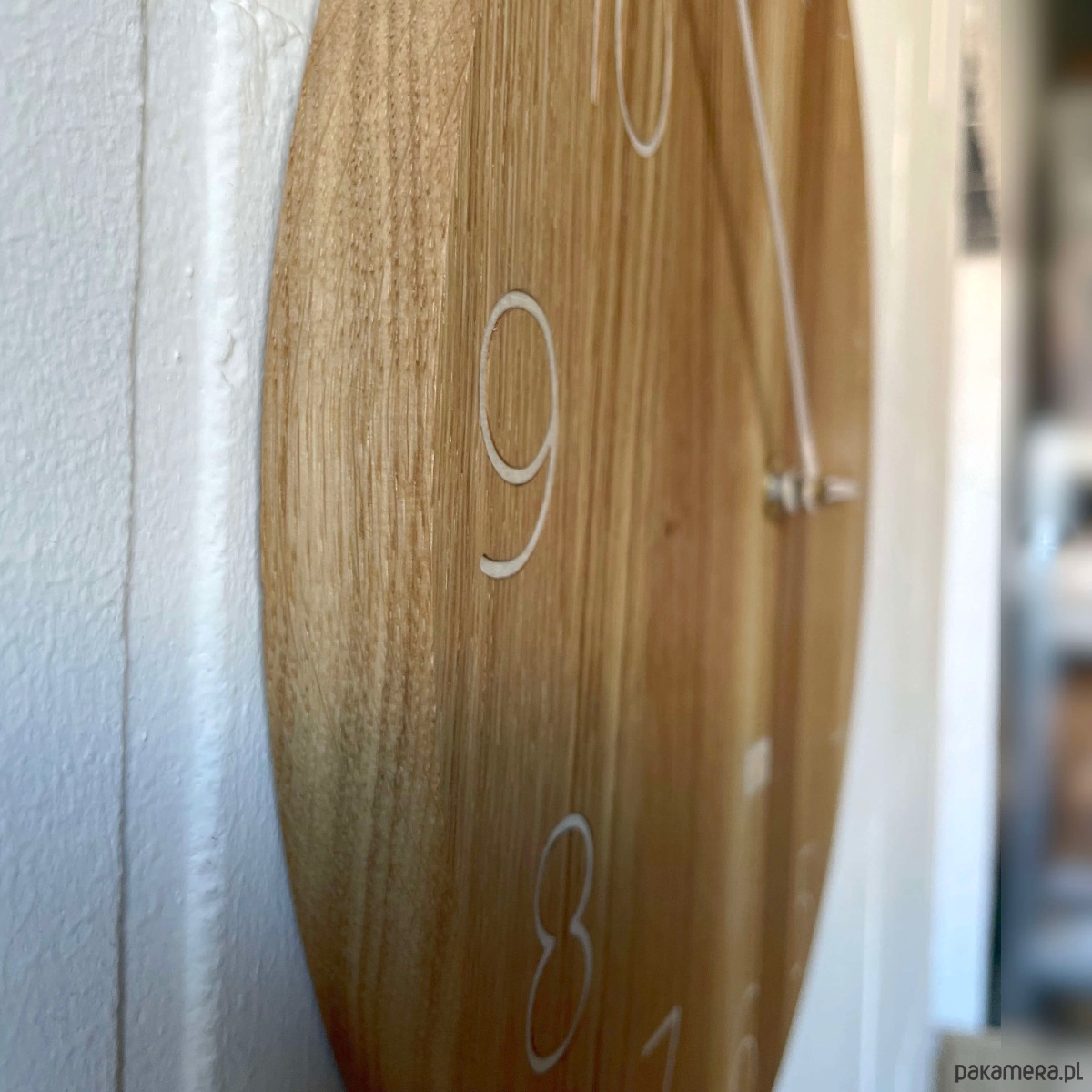 Zegar ścienny wykonany z drewna ze smukłymi cyframi i specjalnie zaprojektowanymi smukłymi wskazówkami. Wygląda lekko i nowocześnie.