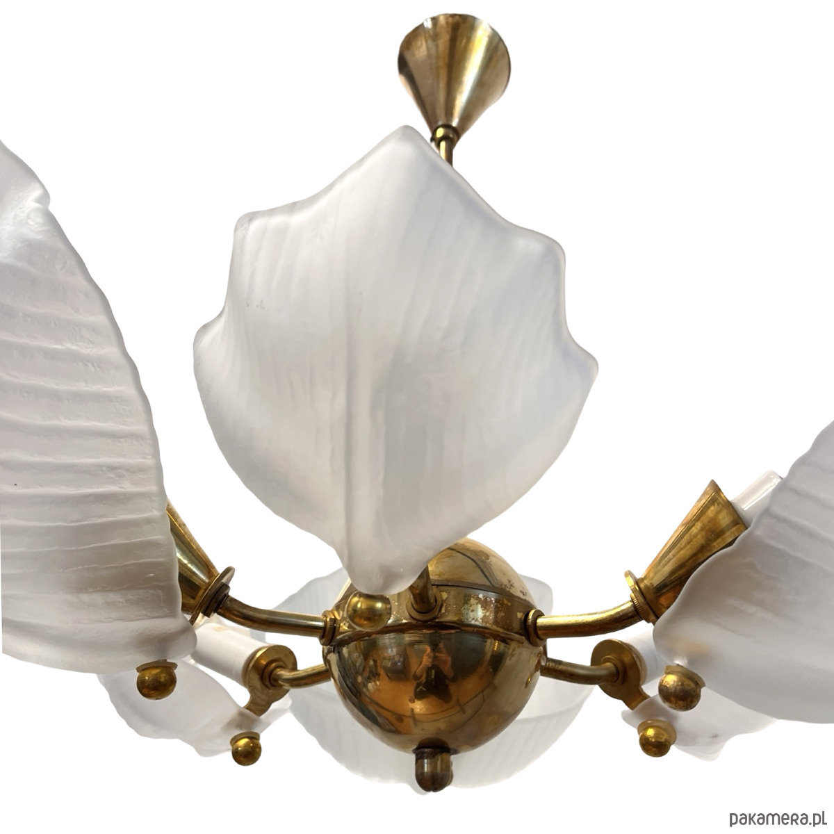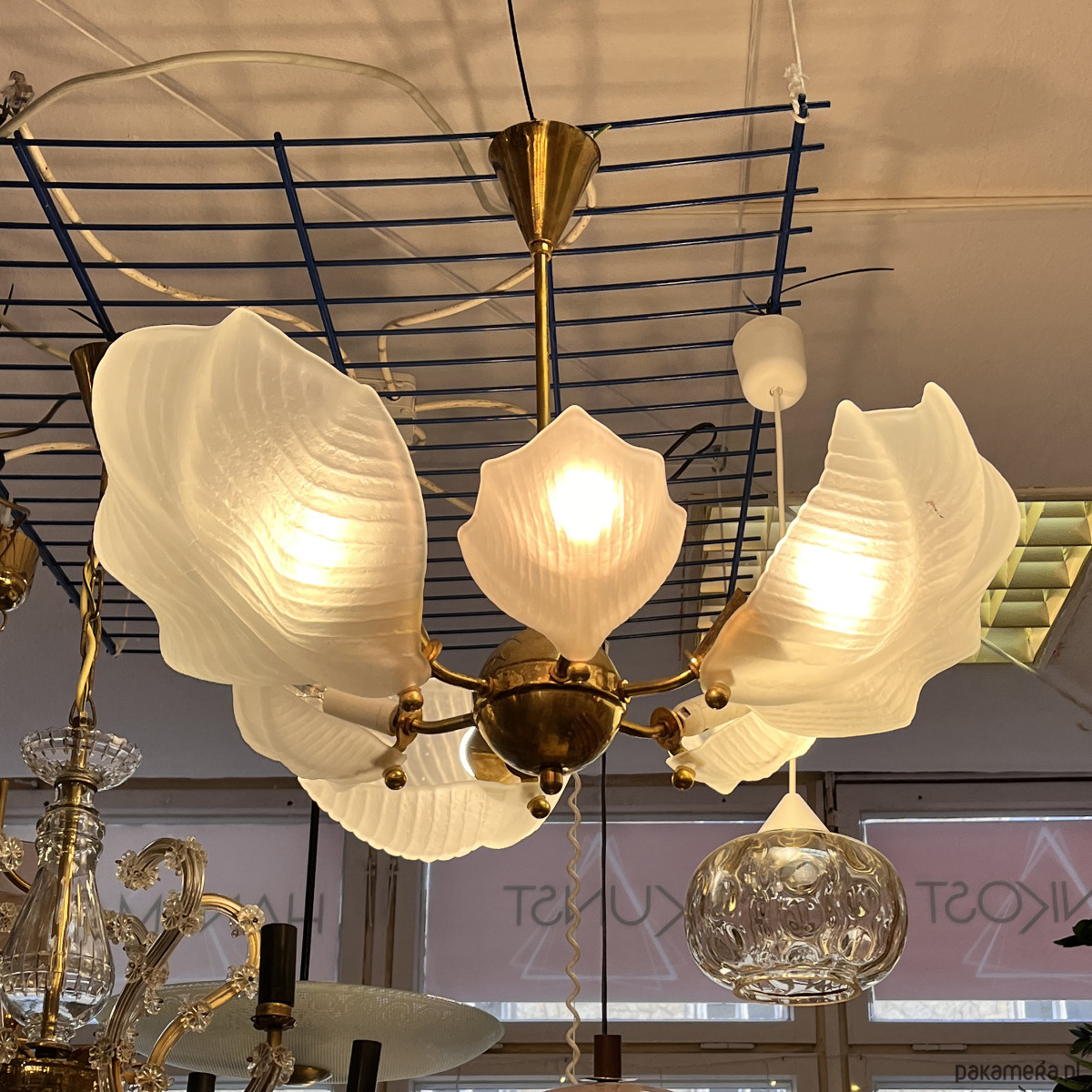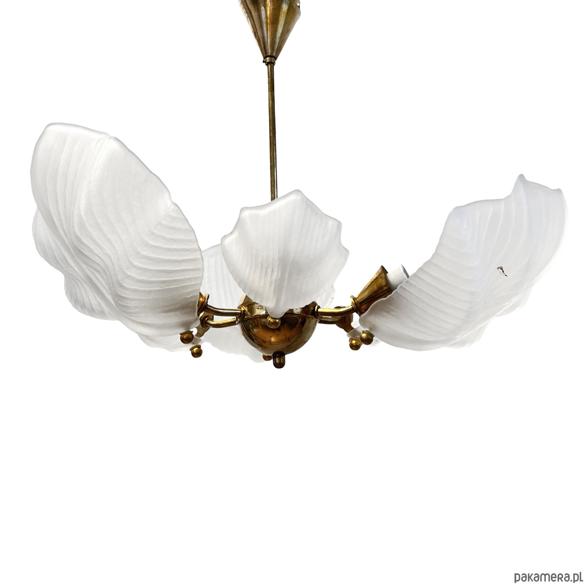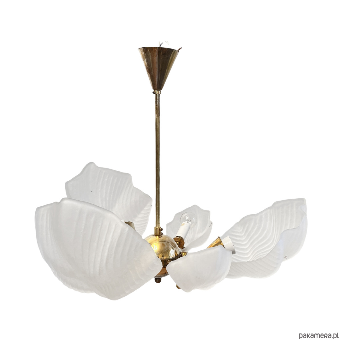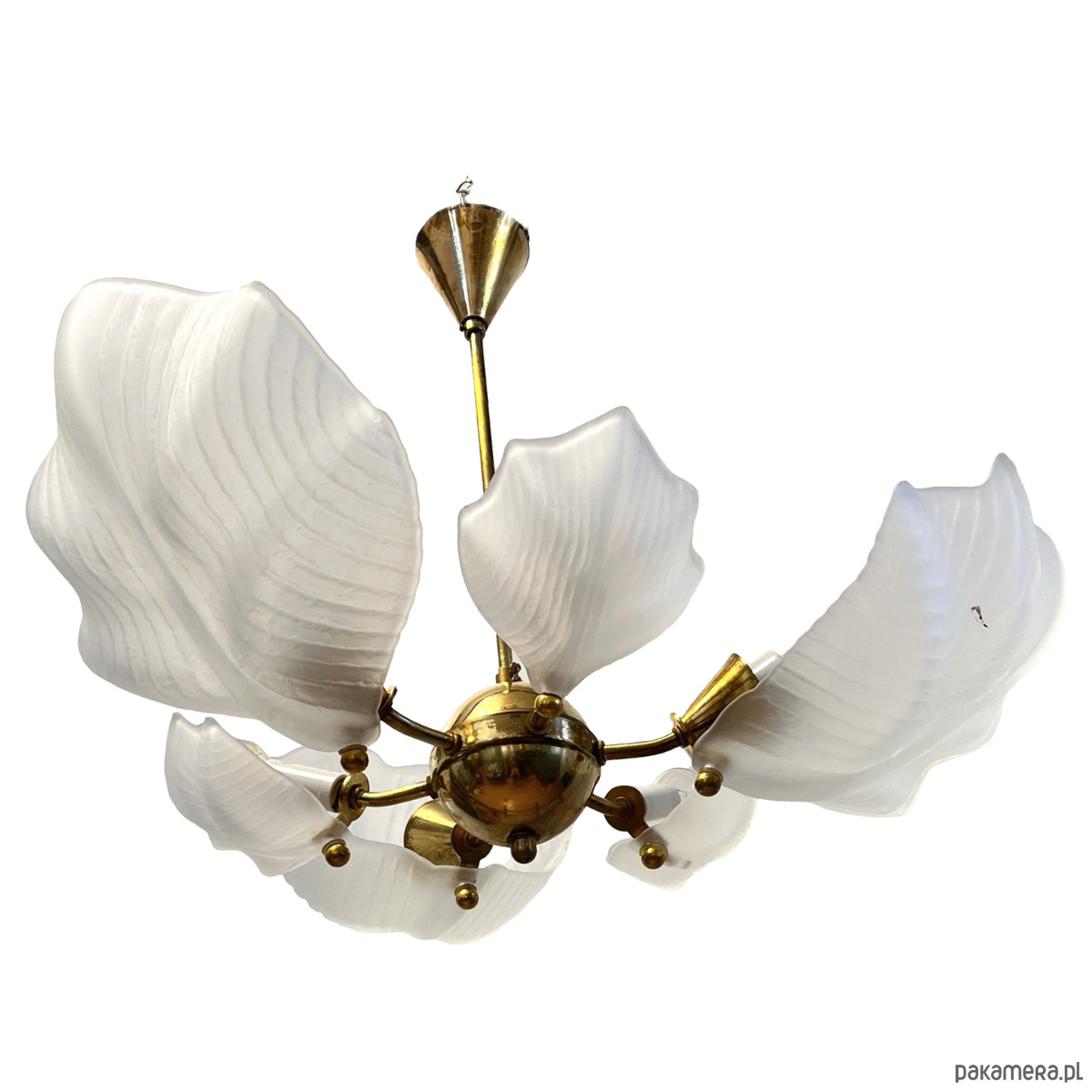 Żyrandol sześcioramienny typ 80082/3+3 w stylu hollywood regency wyprodukowany przez Železny Brod Sklo ZBS n.p. w latach 70. w Czechosłowacji. Lampa wisząca wykonana z polerowanego mosiądzu. Ozdobą żyrandola są piękne, ręcznie wykonane klosze z masywnego szkła o formie inspirowanej liśćmi lub muszlami. Lampa w stanie bardzo dobrym, normalne ślady użytkowania. klosze bez uszkodzeń. Klosze wykonane zostały ze szkła ręcznie formowanego o organicznej strukturze, osłaniają oprawki na żarówkę E27 do 40W - 3 razy oraz E14 - 3 razy.
